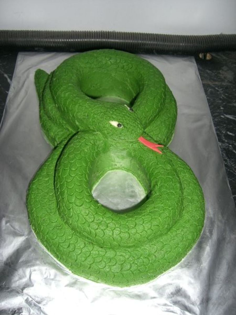 For a little boy turning 8, who loves snakes, and his sirname is Greene, thus a green snake in the shape of an 8. Started with a rectangle cake, carved the shape and covered in BC.