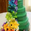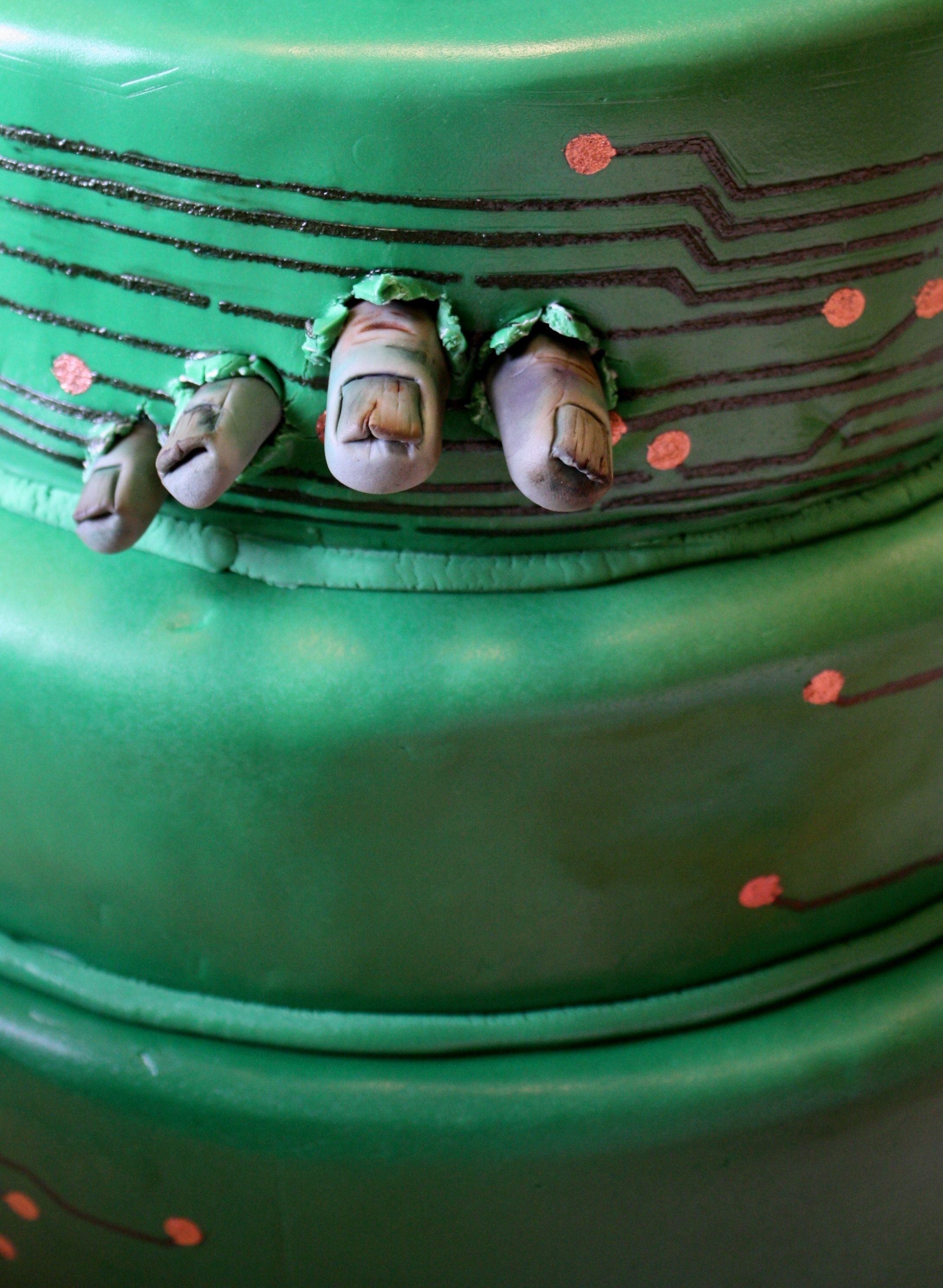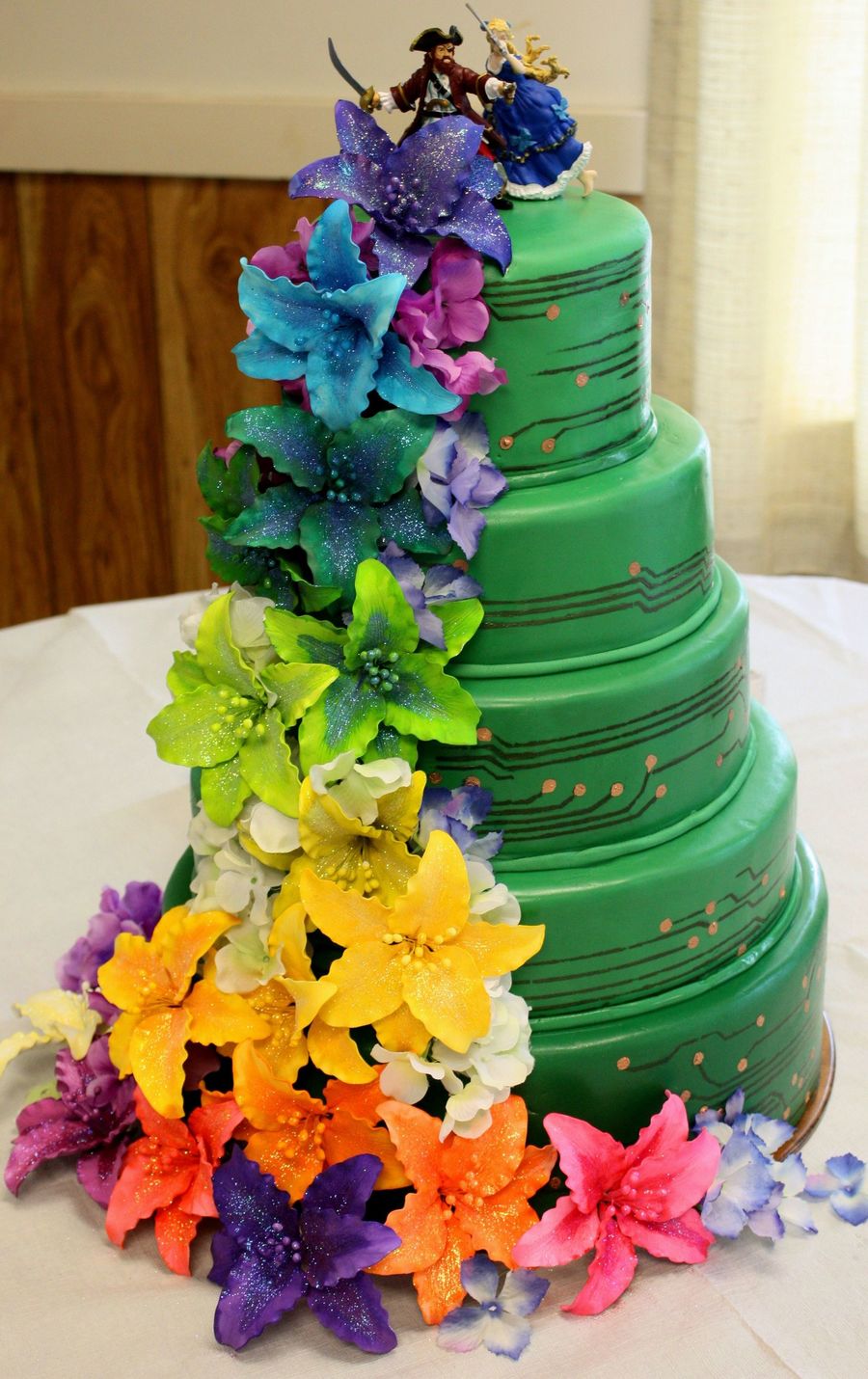 This was a HARD and fun cake...circuit board stenciling around each tier, stencil was custom made, the flowers were purchased white to ease my burden a bit then I dyed each one, on the back of the cake is a gumpaste zombie hand coming out for a surprise for the bride...she loves zombies