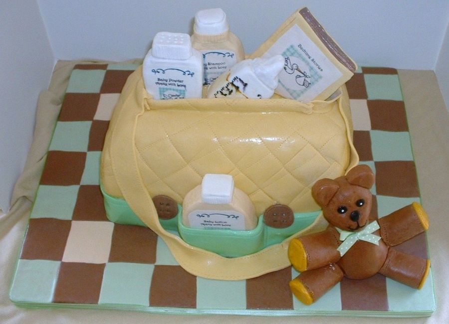 Orange cake with orange cream filling. I covered cake with fondant and quilt with tracing wheel. The book, lotion, shampoo, lotion, feeding bottle was made using crispy treat and covered with fondant. The labels I printed "Baby Lotion - Apply with Love" on sugarpaper using edible ink. The teddy bear was also made using crispy treat. TFL