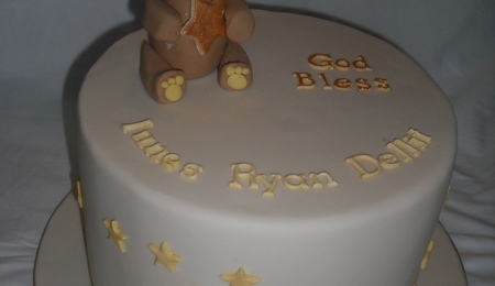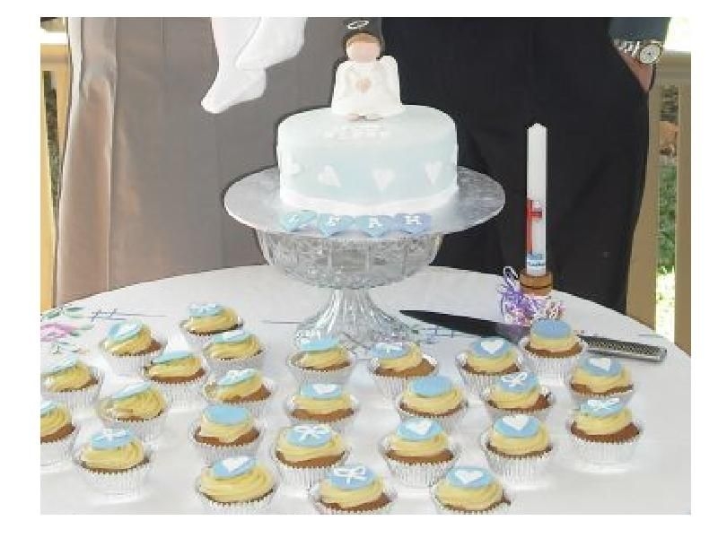 Our daughter's Baptism cake. Lemon flavoured WASC with white chocolate ganache and mauve fondant. It sat in some sunlight and bleached to light blue. Angel figure idea borrowed from youtube. Everyone raved about the taste of the cake and were impressed with my new-found decorating skills (Thanks everyone whose ideas and tips I used). I had so much fun making them! Matching caramel mud cupcakes with plain buttercream icing.