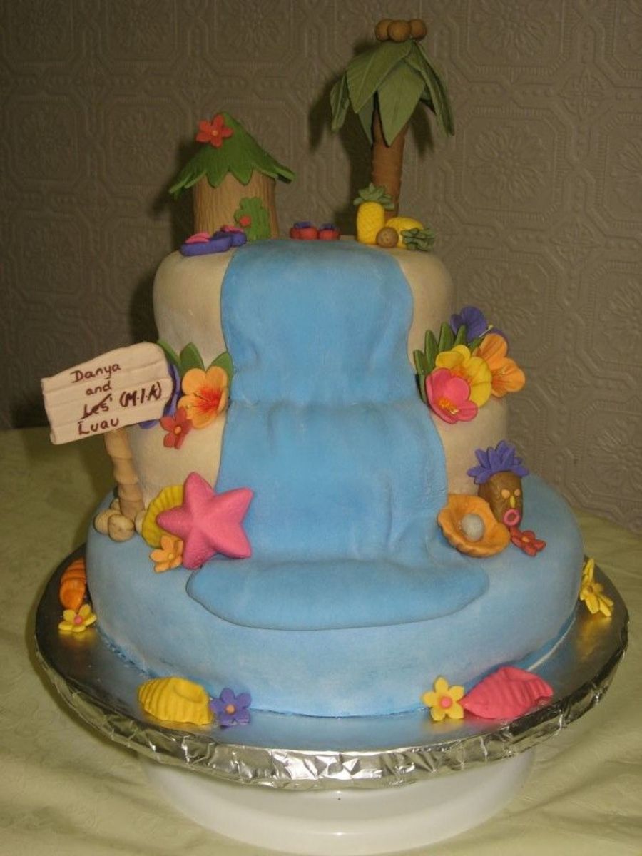 Bridal shower cake covered in MMF with MMF & gumpaste decorations. It was for a co-ed bridal shower but groom got called away to fight forrest fires hence the sign. I swear I looked at every Luau cake in the gallery for my inspiration and design. A fun cake to make.
