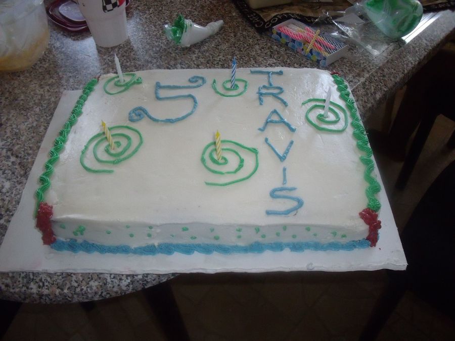 This is a cake done for my son's 5th B-day. My first attempt at decorating. Watched a few videos on-line. I'm starting Wilton so hopefully they will get better.