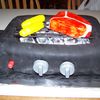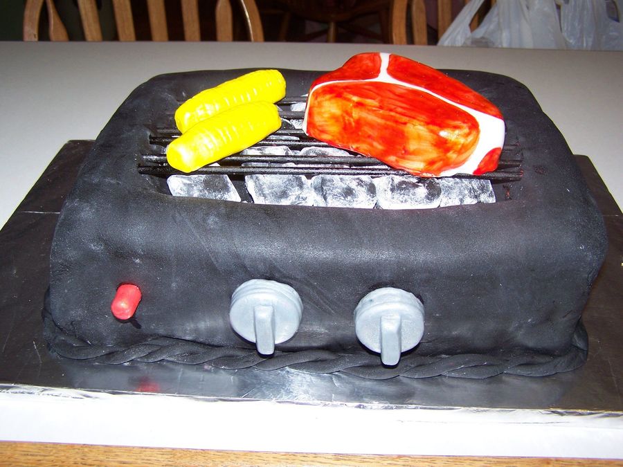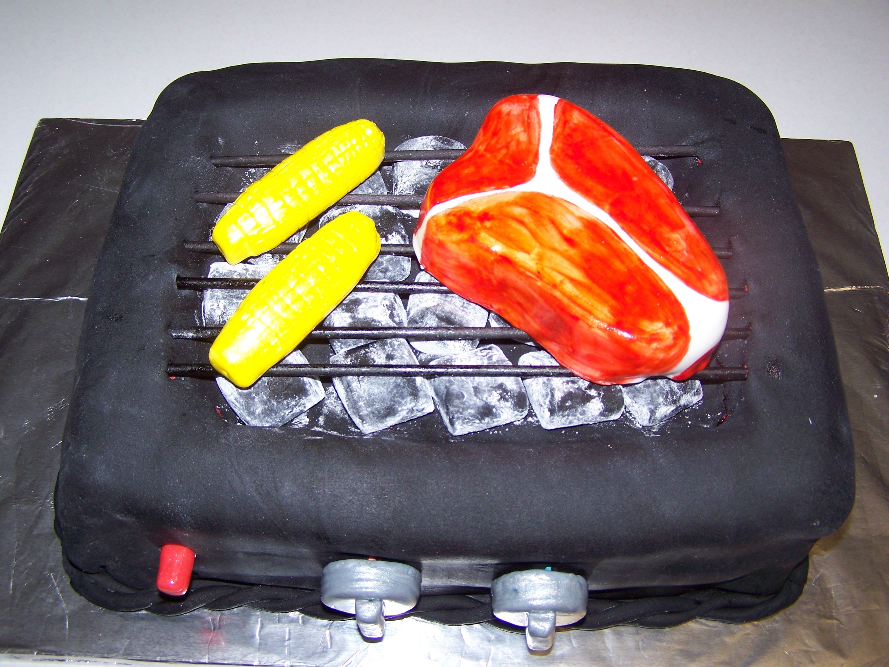 Make this cake for a family cookout. Covered in fondant with fondant decorations, the only thing non-edible were the grill grates.