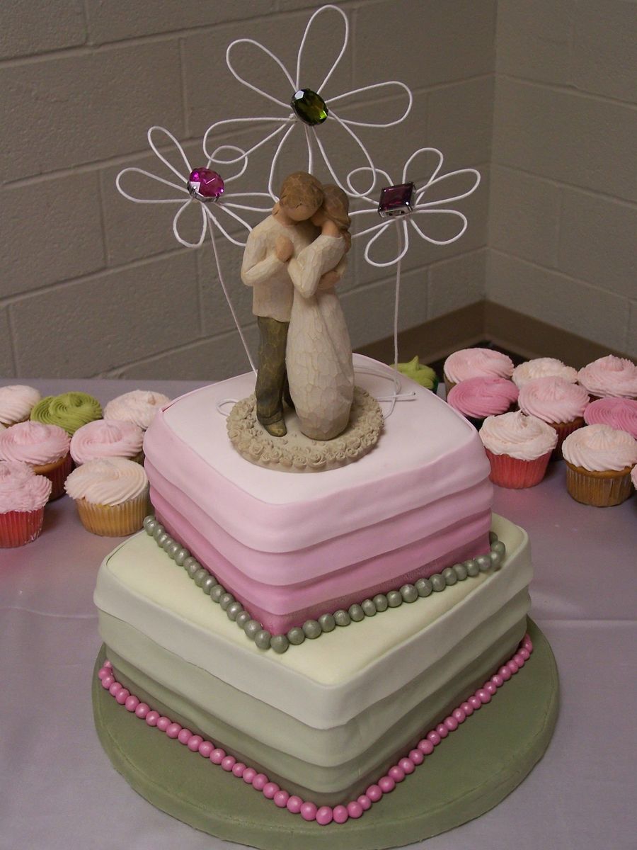 2 tier off center square wedding cake with graduating colors of pink and green horizontal fondant stripes.