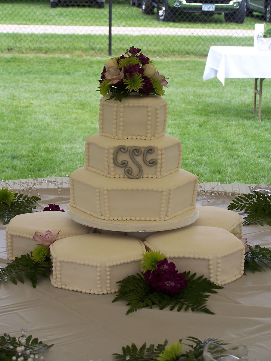 3 tier hexagon wedding cake on top of 5 hexagon sattelite cakes. Gumpaste monogram and fondant pearls.