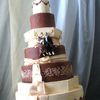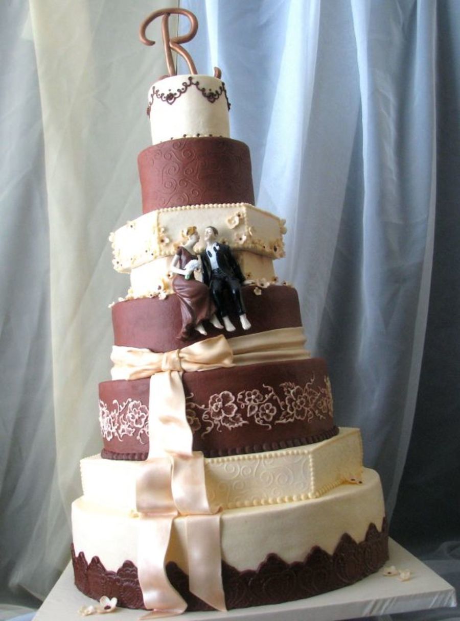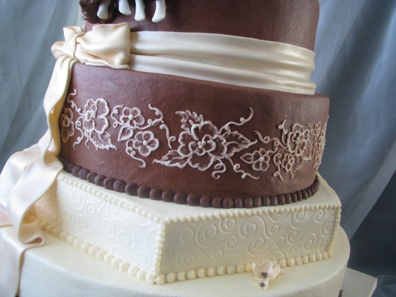 My sister's wedding cake we spent a year planning and tweaking. Gumpaste topper, fondant bow and flowers, styrofoam insert where the couple sits. Delivered already stacked and worked like a charm!