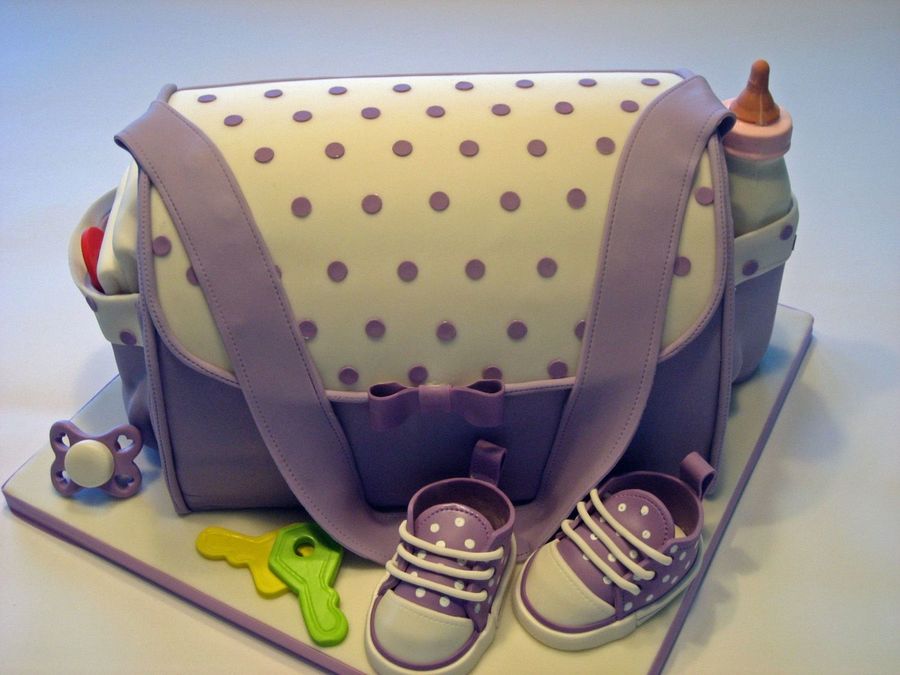 Diaper bag inspired by Heliopops gorgeous cake. The bottle is solid chocolate and everything else is fondant and gumpaste. TFL!
