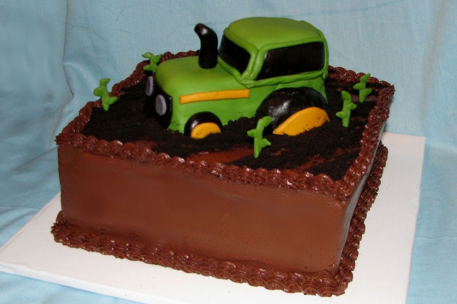 Chocolate Layer cake with chocolate buttercream. Tractor is cake as well. The plants are supposed to be potato plants, but my sister kindly pointed out that they look like beanstalks. ;)