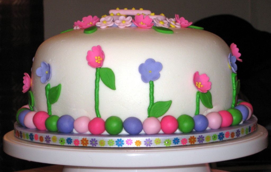 4 layer strawberry cake with Indydebi's butter cream filling - covered and decorated with Michelle Foster's fondant. This morning I had a plain fondant covered cake, some premade flowers and no real idea how I was going to decorate this cake. I got inspiration by looking through the gallery. The fondant is a bit too thick and I think I should've kneaded it more before rolling it out...I'm still learning!