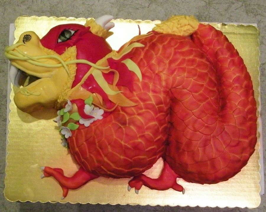 I have been wanting to make a dragon cake for some time and finally I had a reason to do it! It was a time consuming but fun cake to make. It is completely covered in fondant, with each scale cut from yellow fondant, placed individually then airbrushed red. The muzzle is made out of rice crispy treats but the head is cake. It was for a little girl's birthday so I tried to keep it "cuter" looking. I think this is one of my favorite cakes to date.
