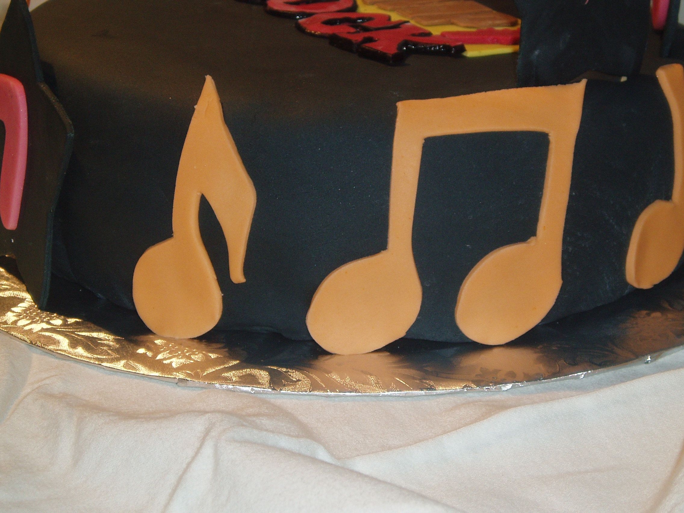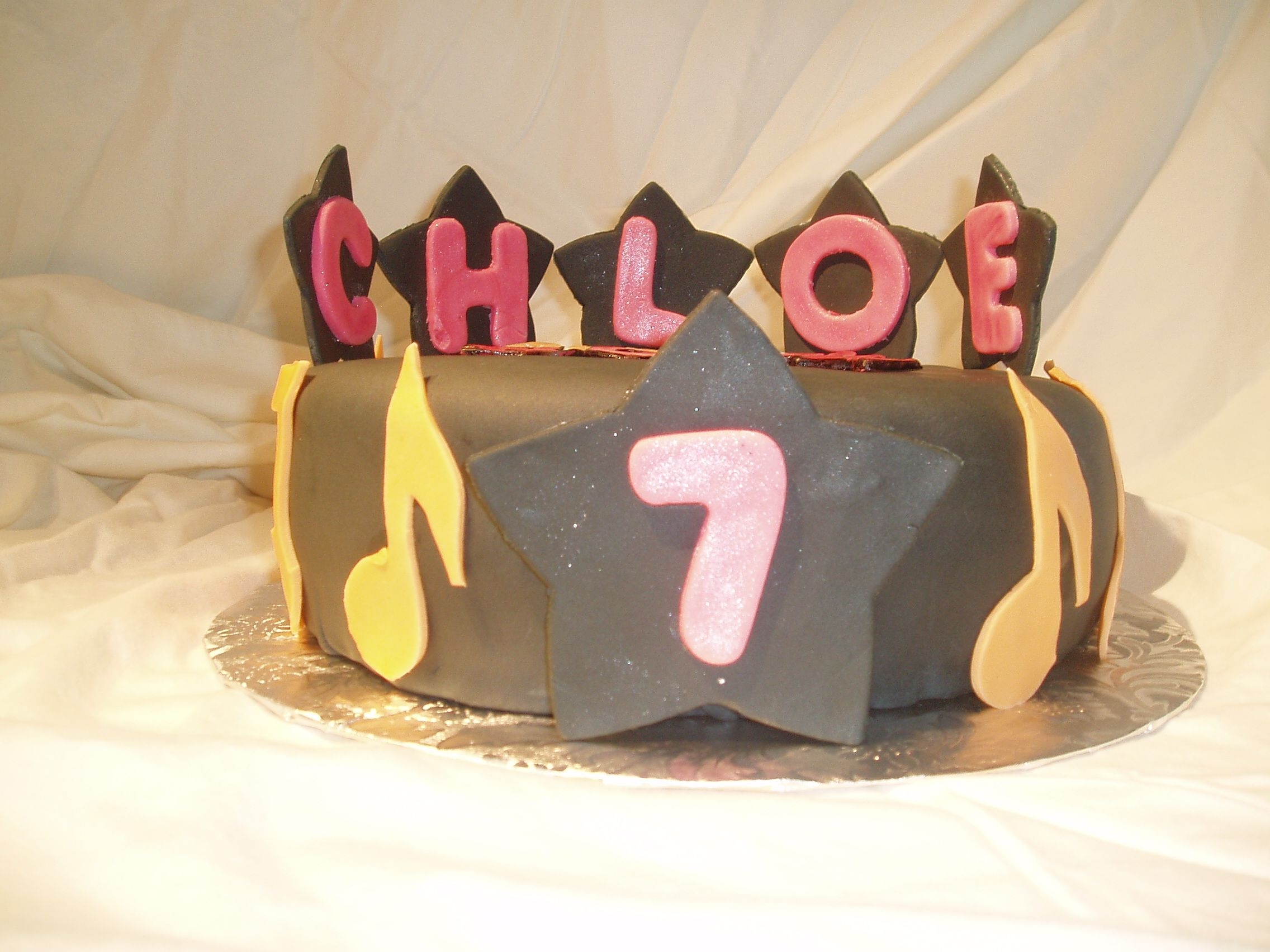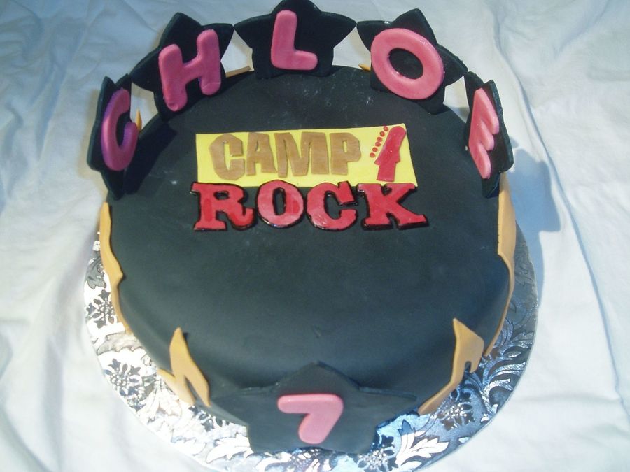 This was for my friend's daughter's 7th birthday. She was having a Camp Rock party. This was my second attempt at fondant, and at least it looks better than my first. For the logo, I printed out a picture from the internet, then cut out each individual piece and used it as a template, cutting out the fondant with a paring knife. Cake is WASC with pudding filling. The birthday girl was SO excited when she saw it!!