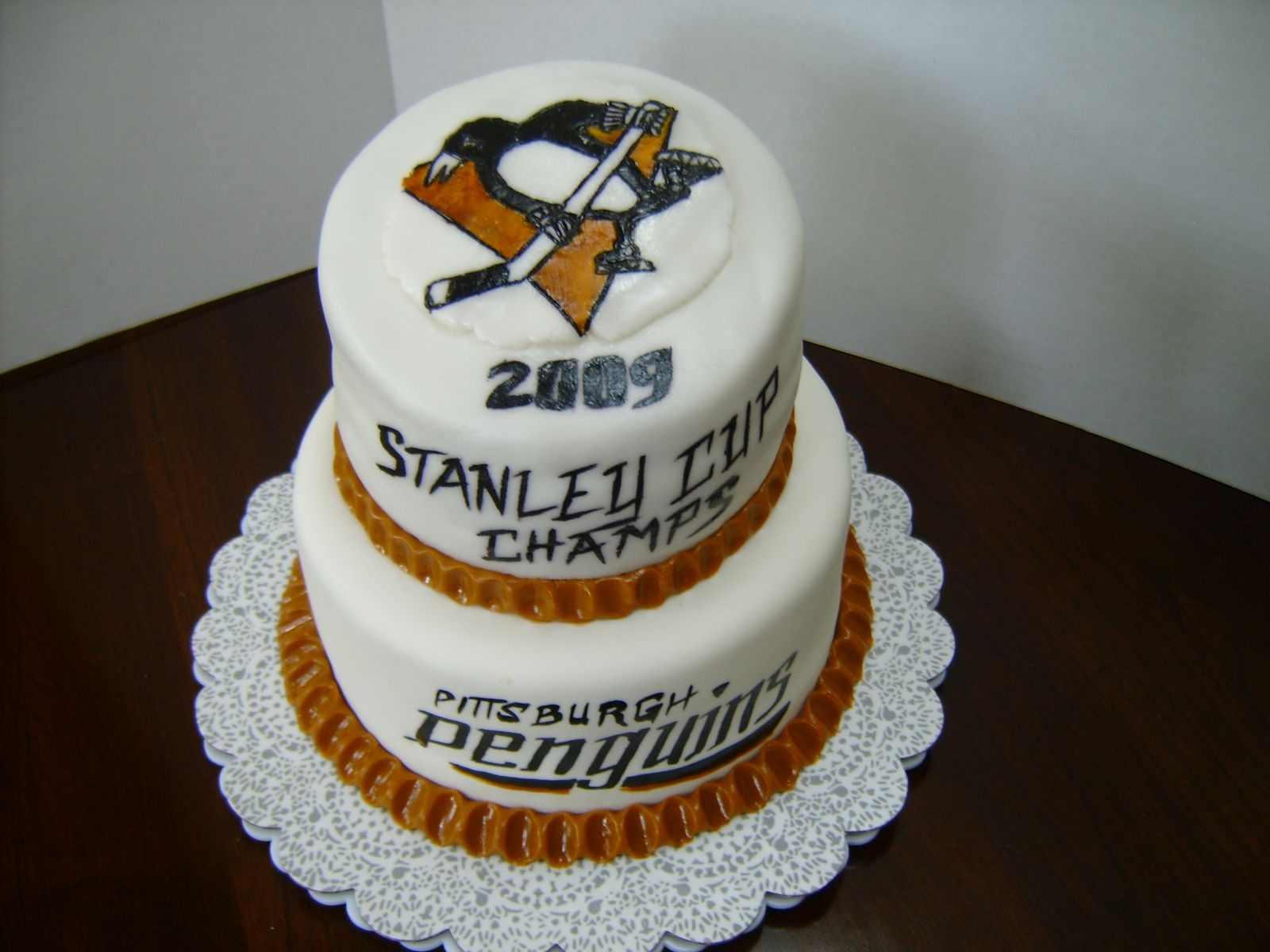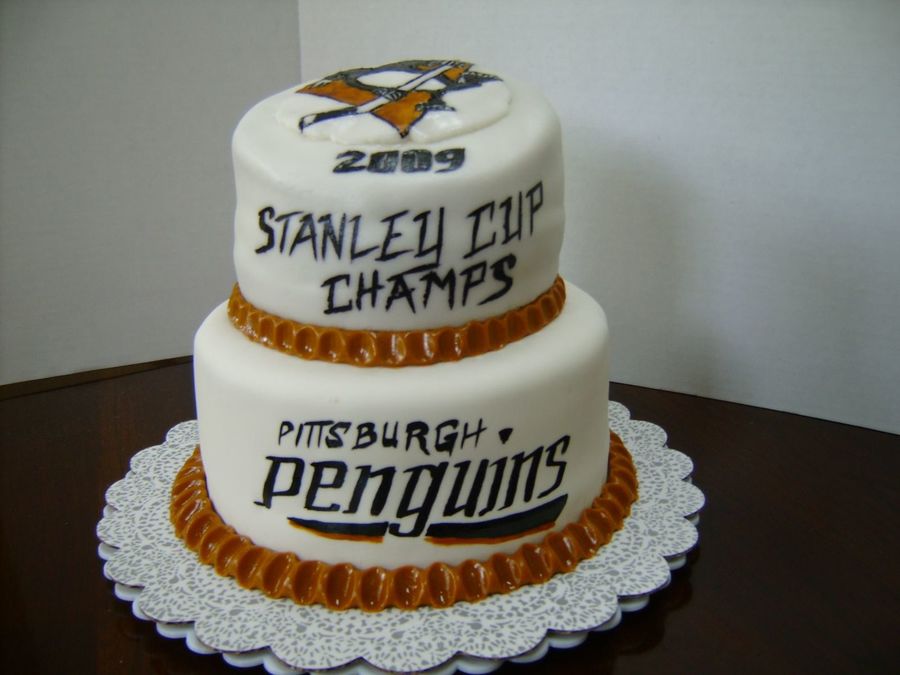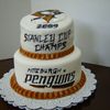 Surprise cake for my boss, HUGE Penguins fan. Bottom tier is covered in fondant, but top tier is Rolled Buttercream (first time using it). Top plaque and borders are rolled buttercream.