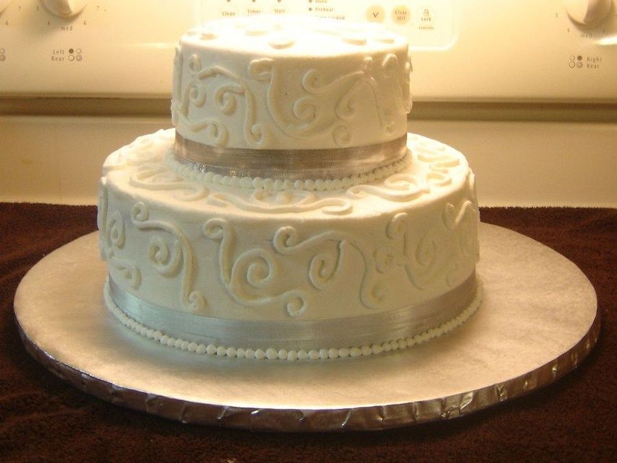 Two tier annviersary cake covered with butter cream icing. Tip 5 used to draw design and ball boarder.