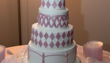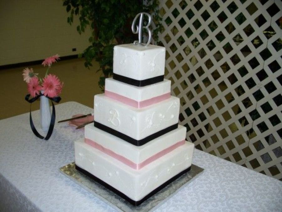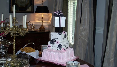 This cake was was my first buttercream square cake. It was made for a very sweet bride. Lucky me. She just wanted a white cake with vanilla flavored icing. The sides of the cake were decorated with small dotted patterns, scrolls and buttercream rose buds.