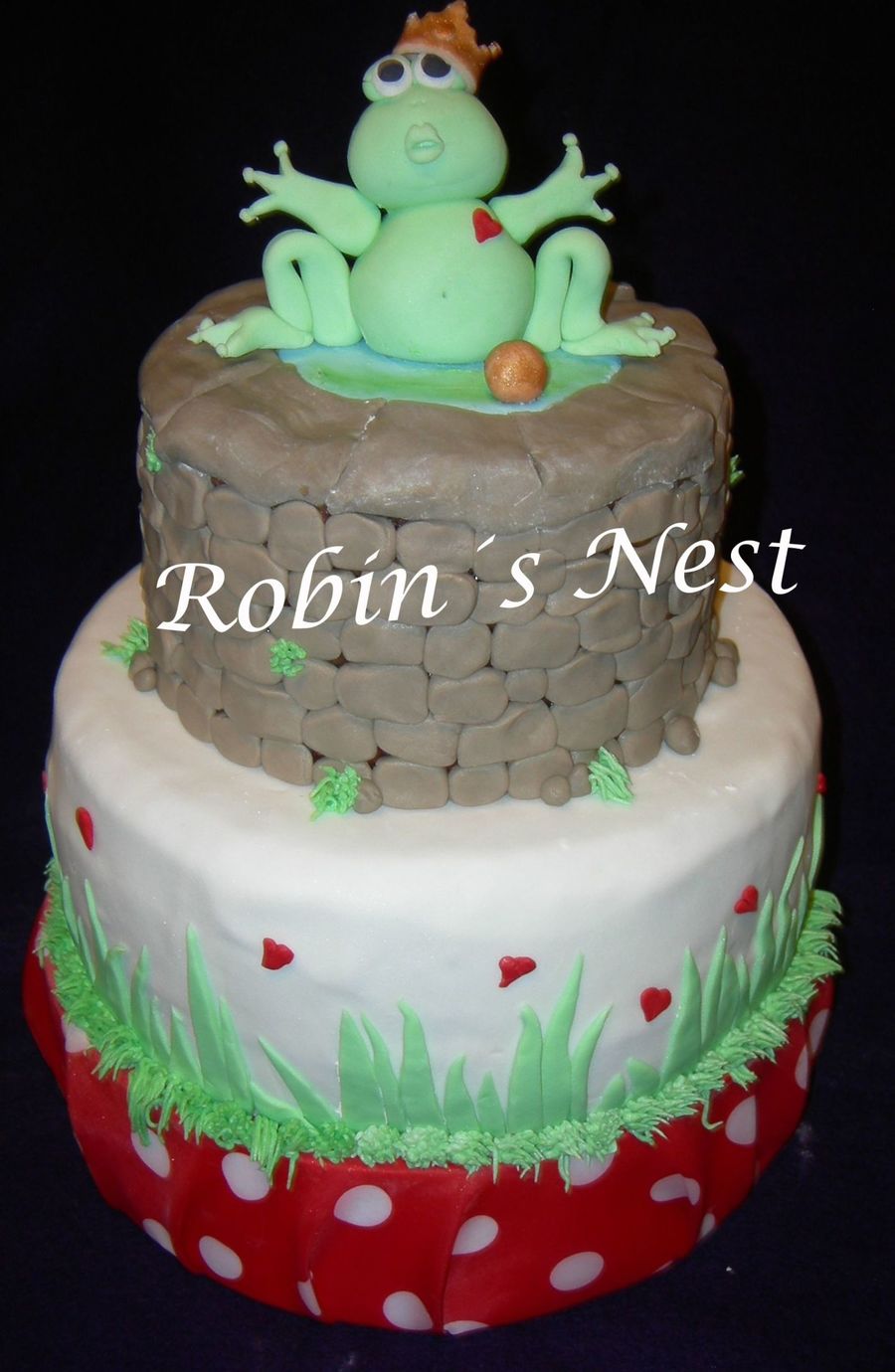 Frog Prince with a golden ball sitting on a stone well. Fondant.