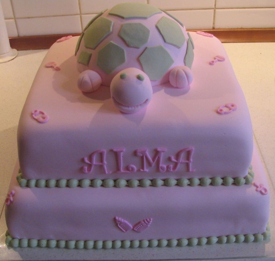 This was made for my neighbours christening. The turtle was made with the wilton sportsball :-)