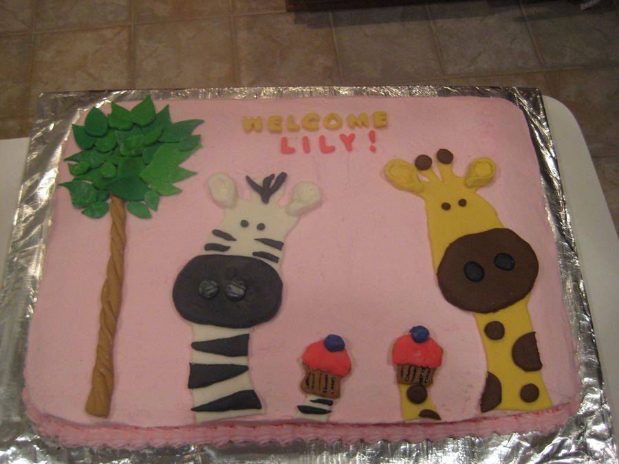Made this cake for a coworker's baby shower. Saw a picture of the Giraffe and Zebra on CC and fell in love with them! :) Thanks anabelz! Buttercream icing with Fondant accents. Thanks for looking! :)