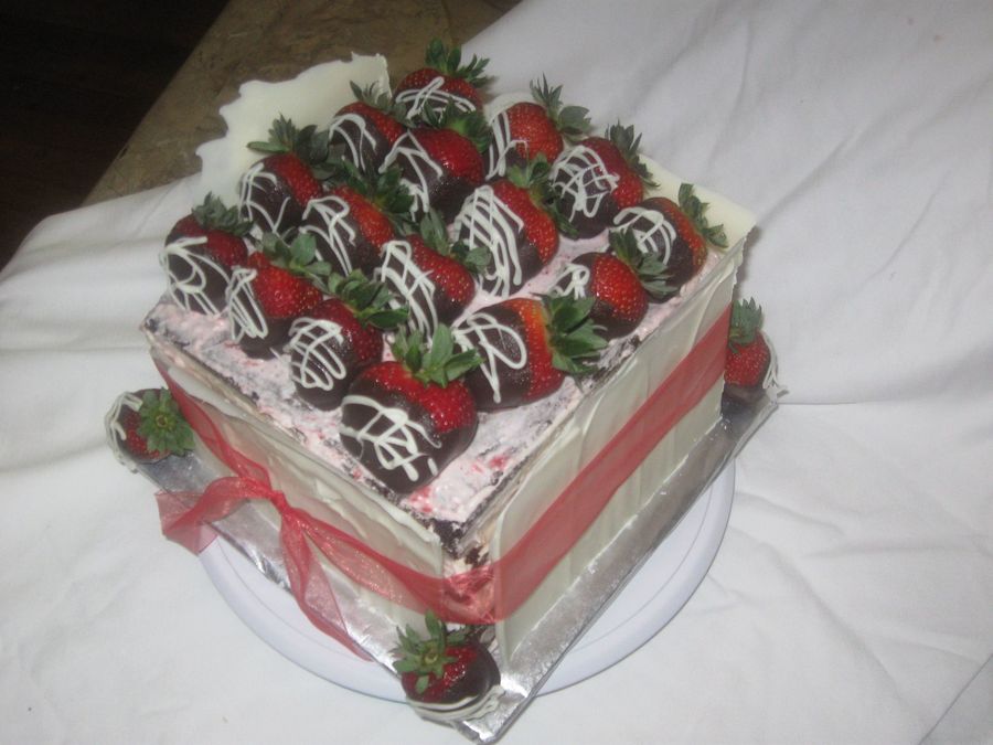 chocolate cake w/ strawberry chantilly creme white chocolate side panels and topped w/ dipped organic strawberries and drizzled w/ white chocolate.