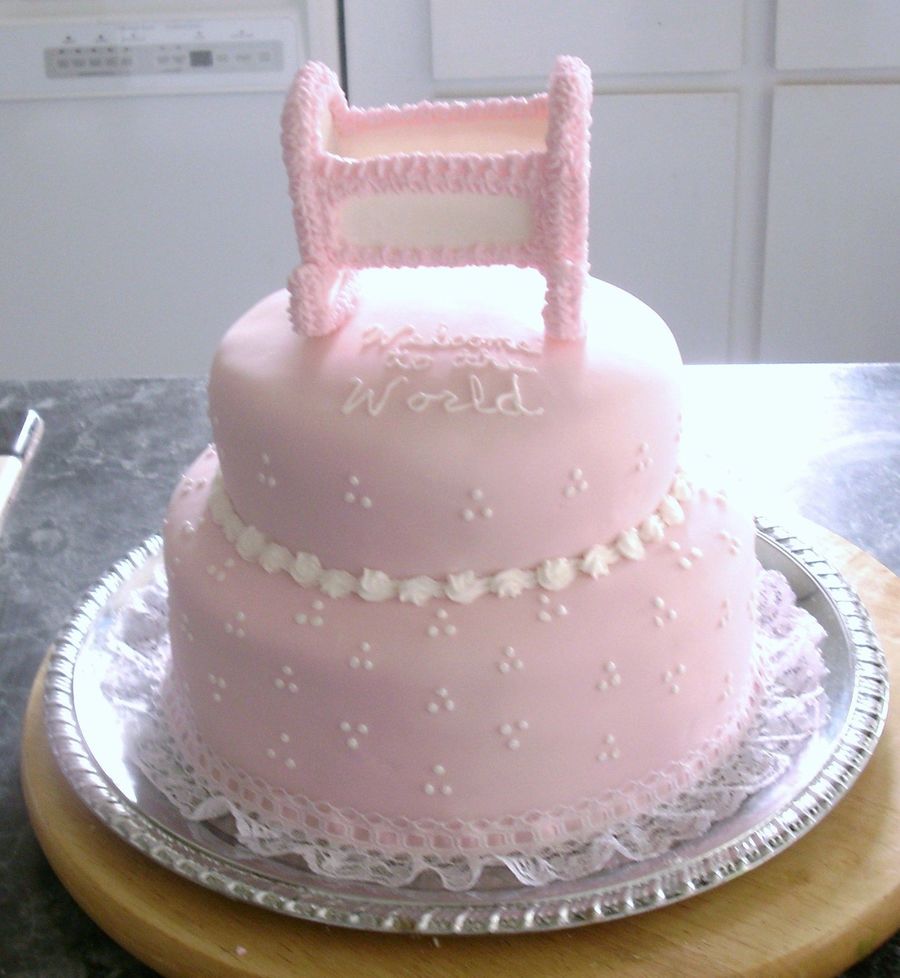 Chocolate cake on top, white on the bottom. Covered with buttercream and then topped with MMF with a bit of almond flavoring. It was soooo yummy. The cradle was made of sugar clay, the baby and blanket (inside the cradle) was made with candy clay. The baby and blanket turned out real cute but the picture I took didn't. :-(