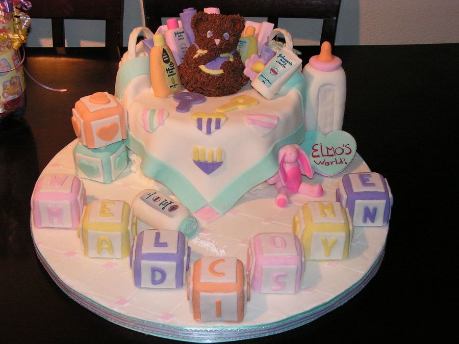 This was done for a friends baby shower. Its a basket weave with a fondant baby blanket on it covered with fondant gift basket items the blocks are rice crispy treats covered with fondant. The "spilled" baby powder is just powdered sugar. The bear was made in the small wilton pan.