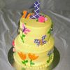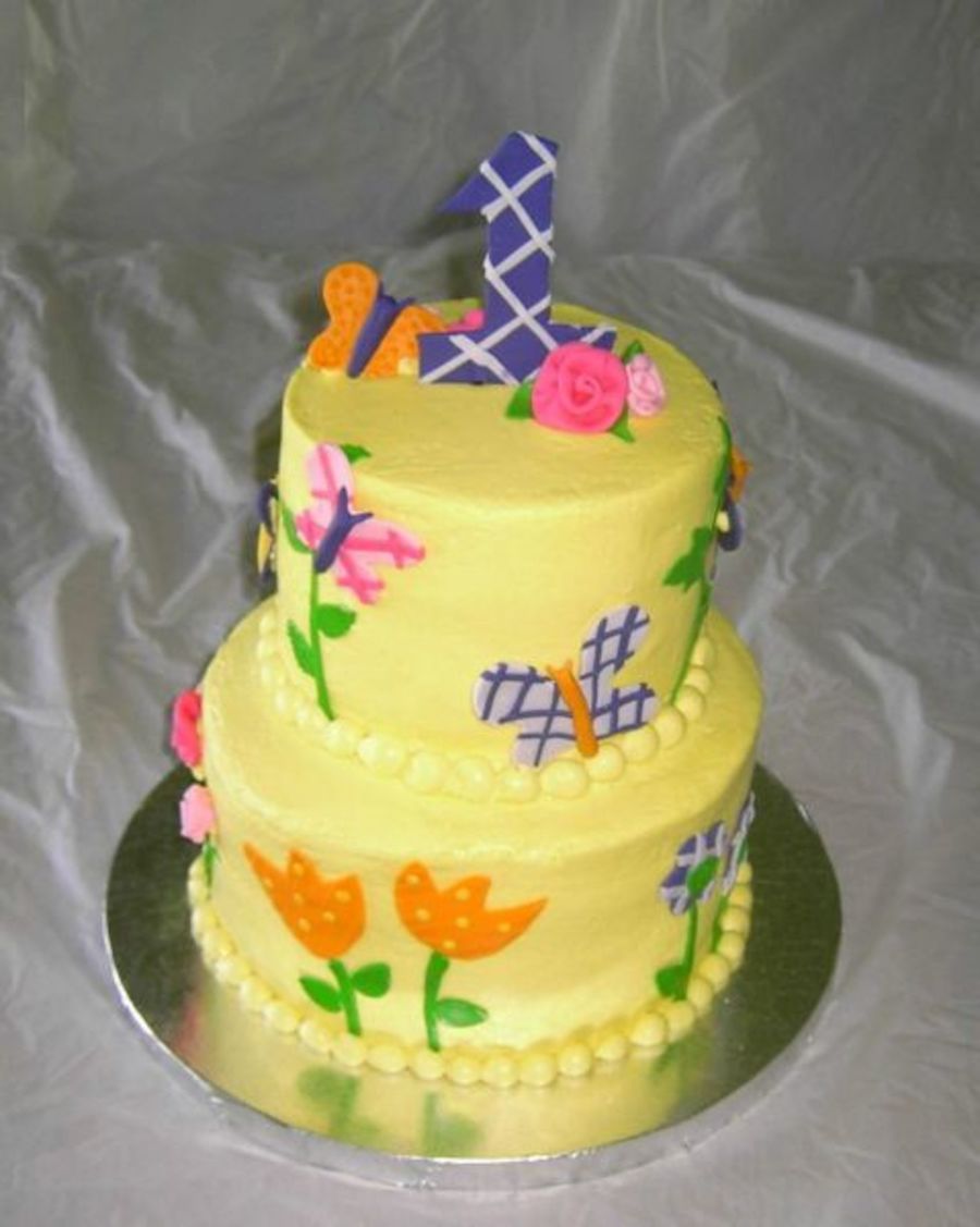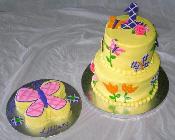 First birthday cake made to match invitations and partyware that fatured "textured" flowers and butterflies. 6" and 8" cakes. Both vanilla butter cake with strawberry mousse. Cream cheese icing with fondant decoration.