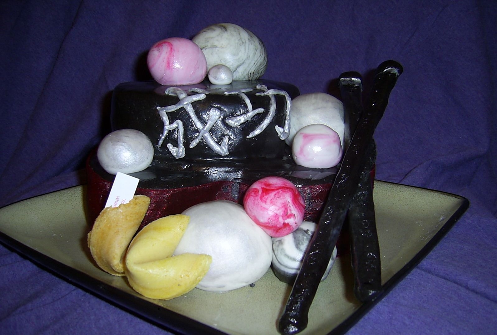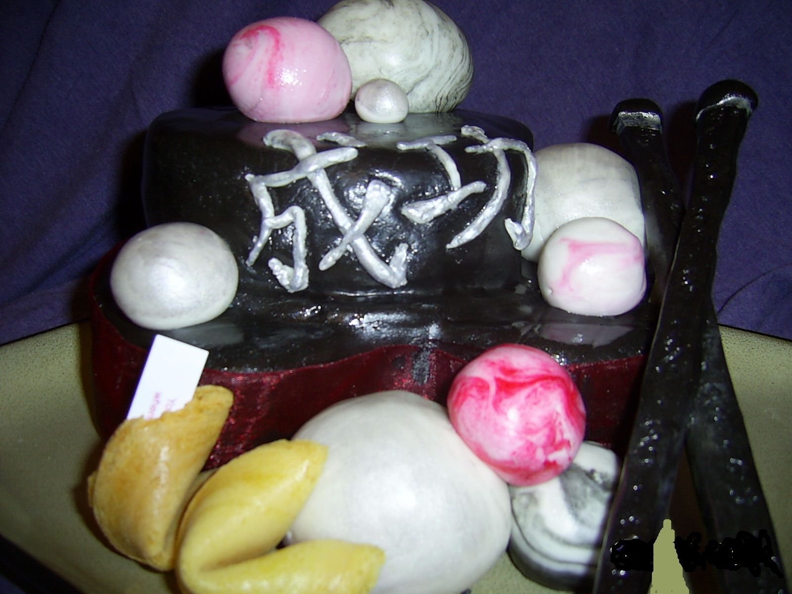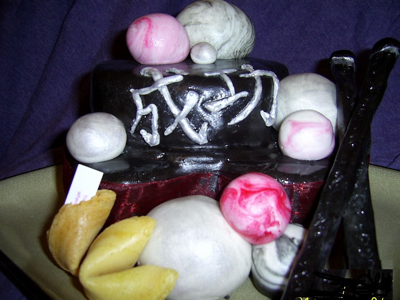 This is a cake I did 7/24/09. It is a practice cake.Key lime flavored cake with cream cheese icing and mmf overlay. I am a self taught decorator and this cake proved I don't know what i'm doing with mmf. I tried mmf for the first time on this cake and it was a disaster. It tastes real good but it ended up looking like dried up gum. I tried to smooth it and it did the elephant skin look and it was falling off in the back(notice no 360 view ) lol. Where did I go wrong I don't know. Off to practice again. If you have any advice please feel free to leave it I won't quit until I perfect mmf. Like the chinese writing on the cake says "SUCCESS" . I to will be a success at mmf lol :)