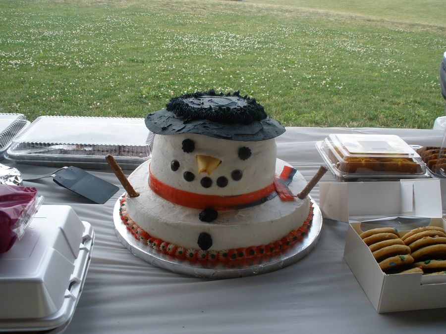 This was for Christmas in July. 14" yellow torted with strawberry filling, 2- 8" (1 butter & 1 chocolate) cakes with raspberry filling, and a bowl cake on top. The brim is a cut paper plate covered with the black frosting. Covered with BC. The nose is a half fortune cookie, scarf is a fruit roll up, eyes and buttons piped butter cream, mouth 5 large M&Ms, and lastly 2 pretzel rods. Everyone enjoyed it!