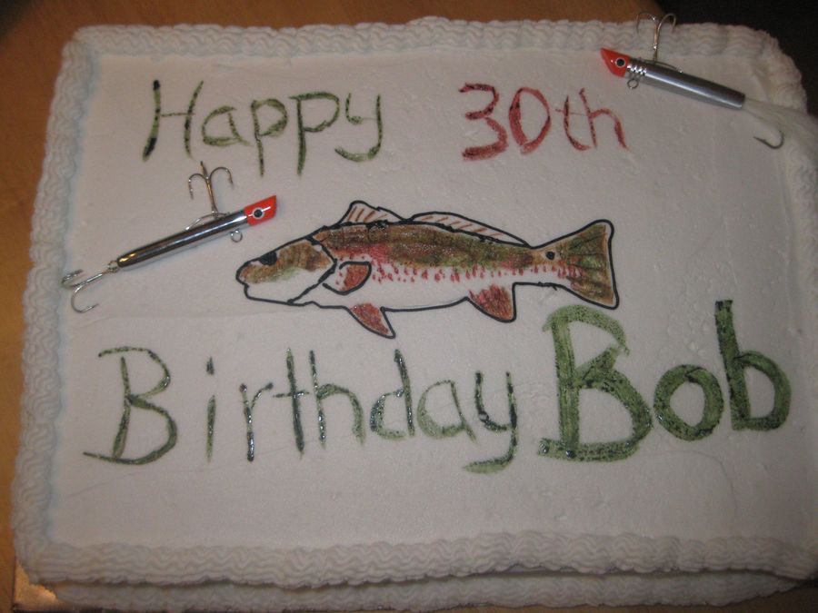 chocolate cake with white buttercream icing red drum fish painted on icing