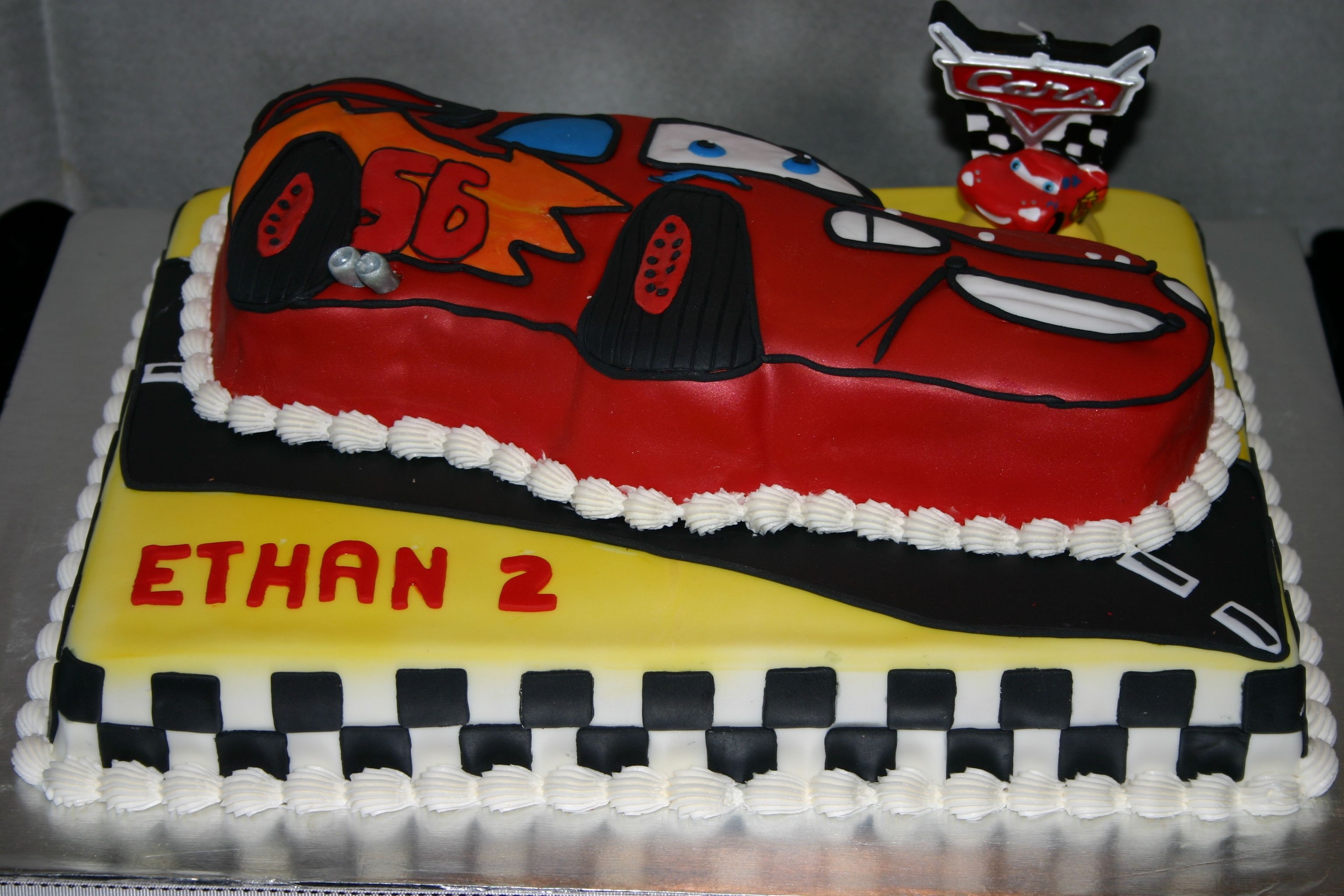 Cars Cake done with Wilton Charater pan. Done with fondant, airbrused red pearl.