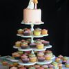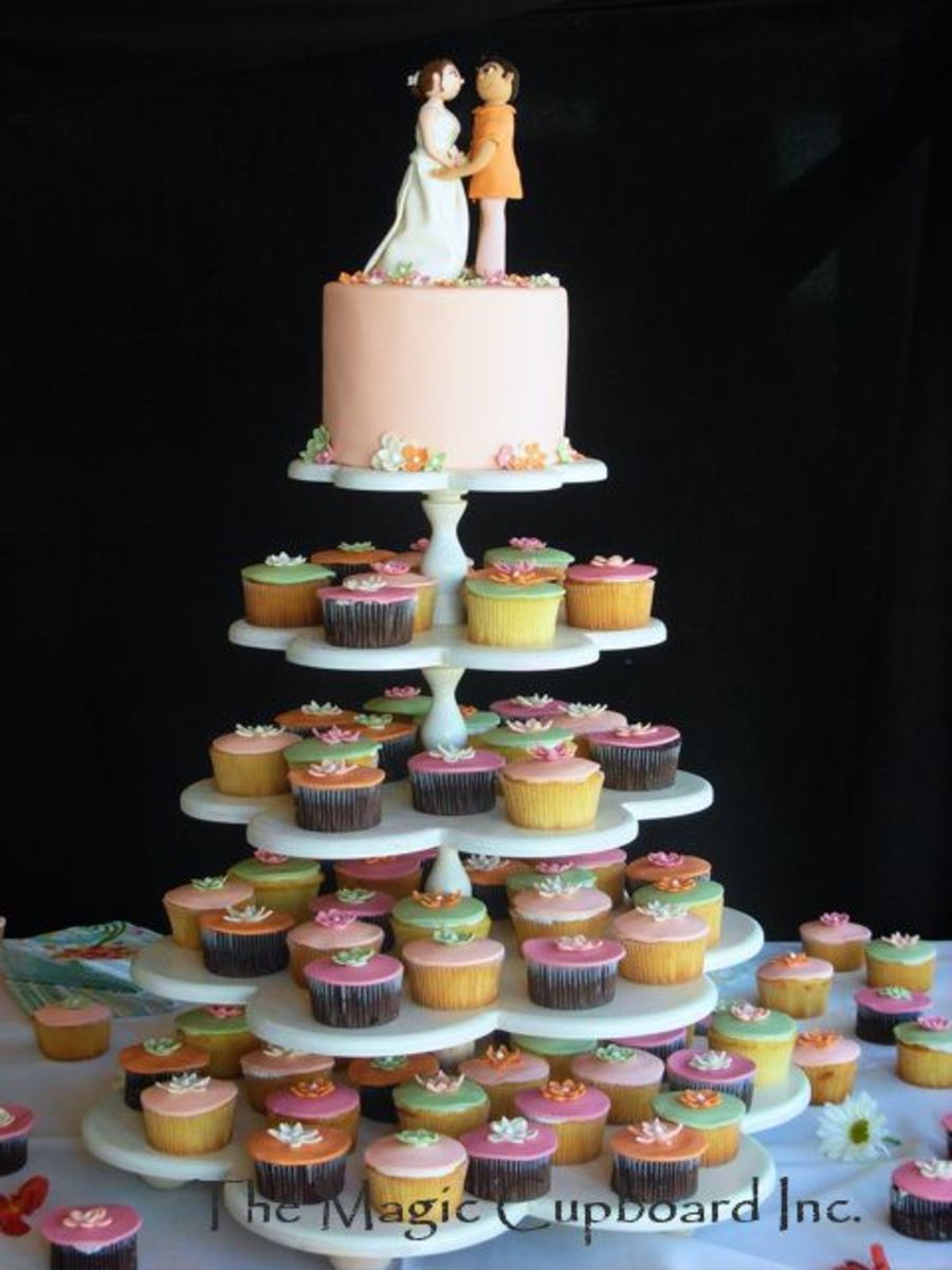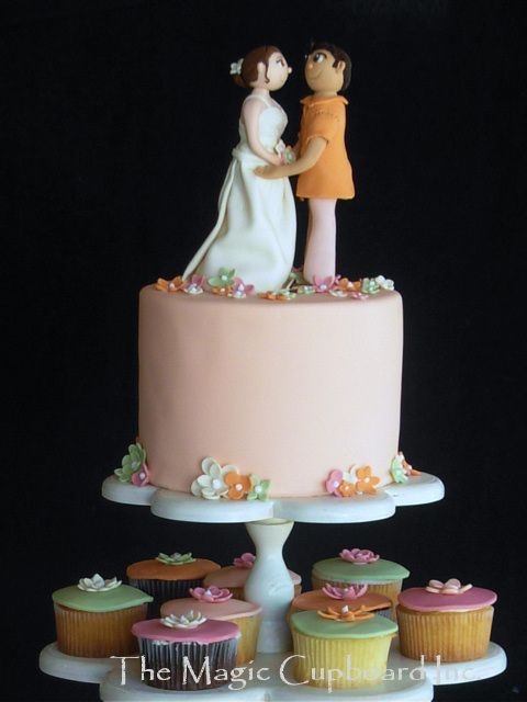 cupcakes topped with fond. circles and a 6 in top tier covered in fond. Couple made from gumpaste and fondant, TFL!