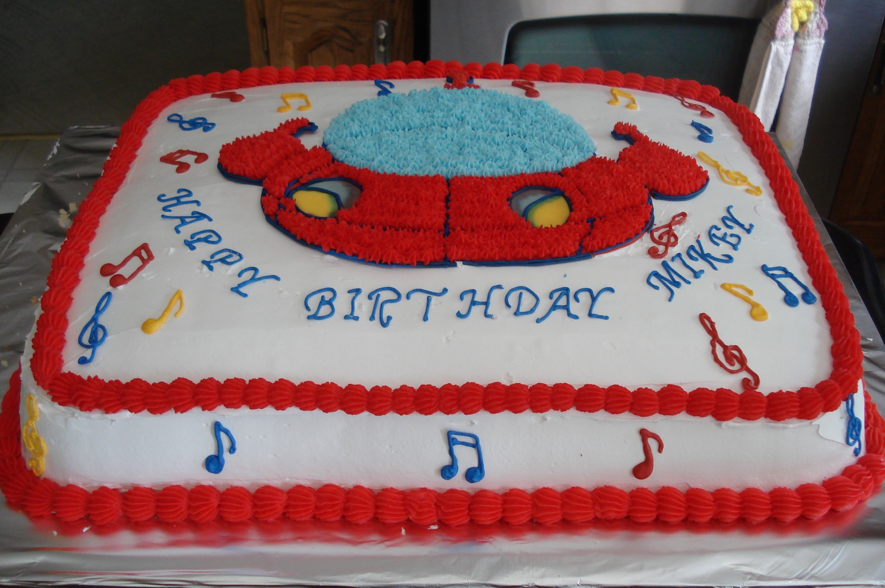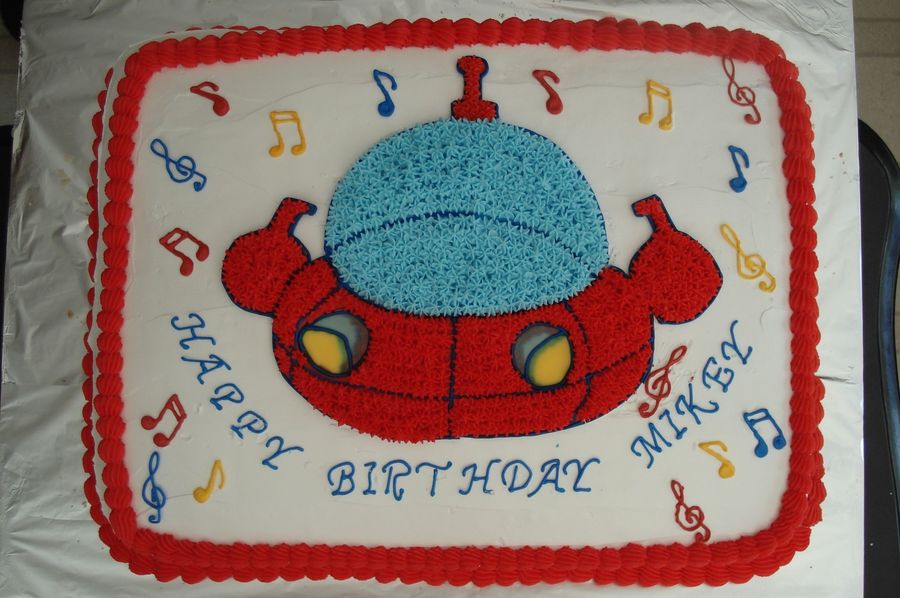 This is Little Einstein's Rocket. It is a vanilla cake with strawberry filling. All buttercream except the music notes are colorflow.