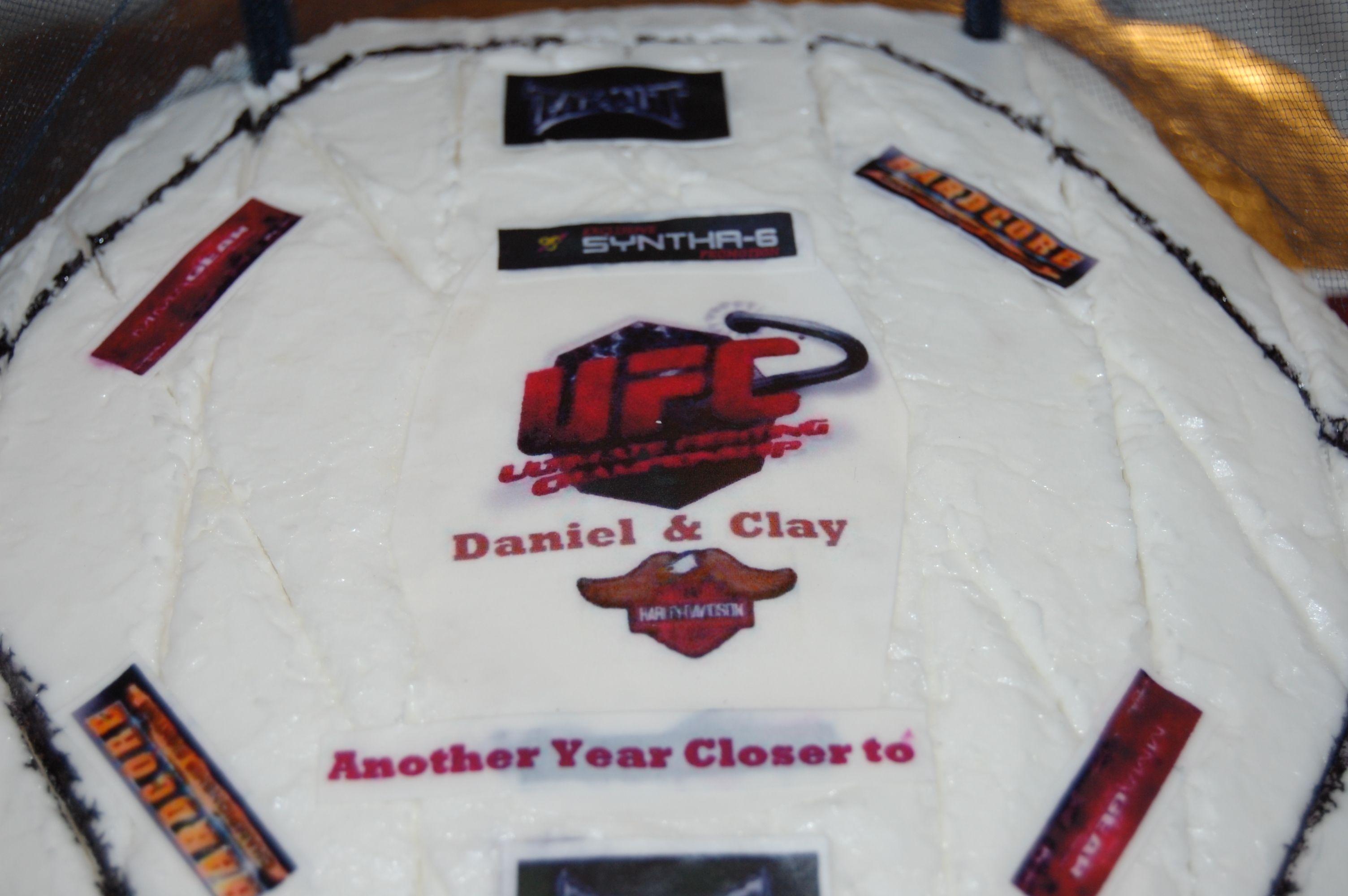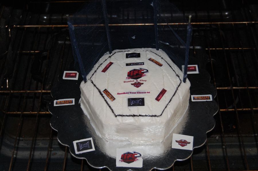 UFC cake, octagon, Had alot of problems with thsi cake. My b/c wouldnt make right, did the EI's and its only my 2nd time using them, cant figure them out as of yet, Then I "thought" I had the net figured out, NOPE..wasnt as easy as I thought, my fingers still have glue on them. And last but not least, As you can see I couldnt do the Octagon outline in black right...the left side is way off!!!! I sure hope there ok with it tomm. The woman doesnt even cook, she said anything would be fine. PLEASE INPUT, AS TO HOW I CAN IMPROVE THIS. TKS.