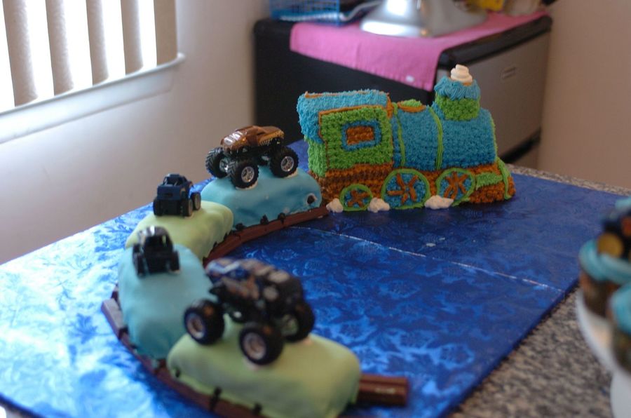 I made this train cake for my sons 3rd birthday. He was having a monster truck birthday but we rented a trackless train to come take the kids for a ride. So I tried to incorporate the two themes. This was my first time making a 3D cake.