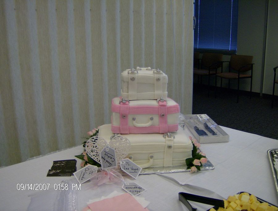 3 tier suit cases for bridal shower. white cake with pink and white fondant