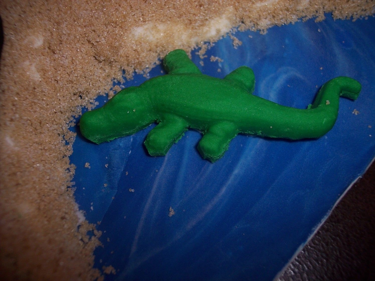 A lady I work with always has theme parties for her grandchildren. This little girl is turning five and decided she wanted a pirate theme. The cake is based on the plates & etc they got @ oriental trading. Cake is fondant with fondant hearts & gumpaste based scull & crossbones with a fondant covering. Eye patch, treasure map, & alligators are fondant. Sand it brown & white sugar mixture.