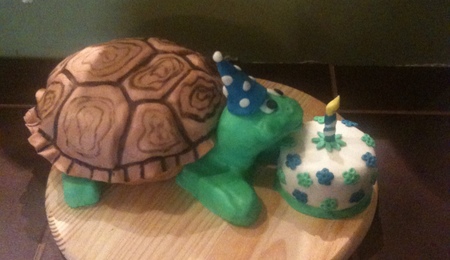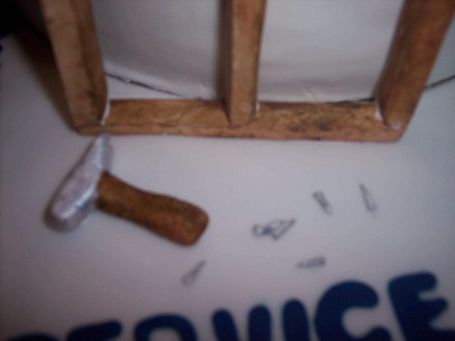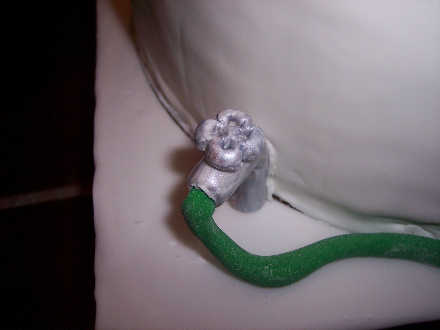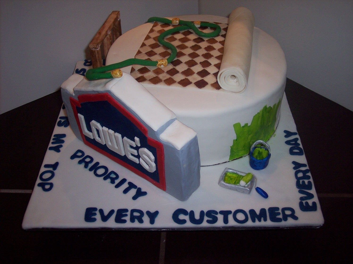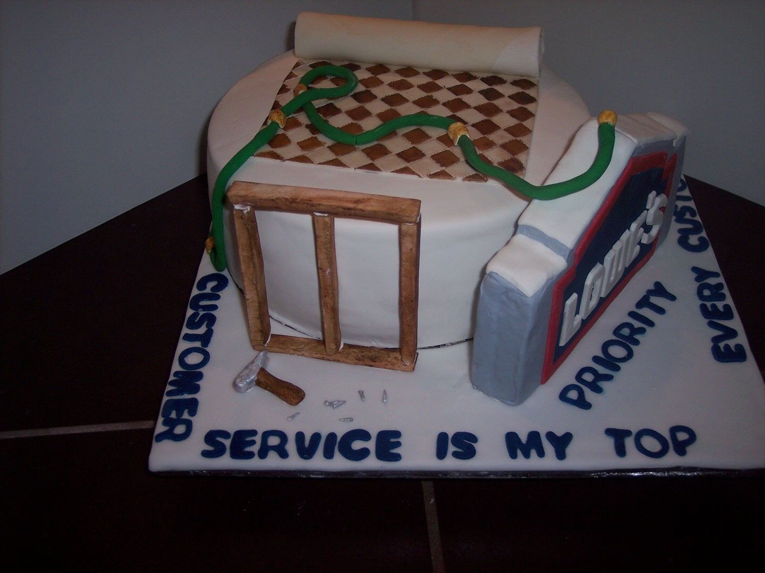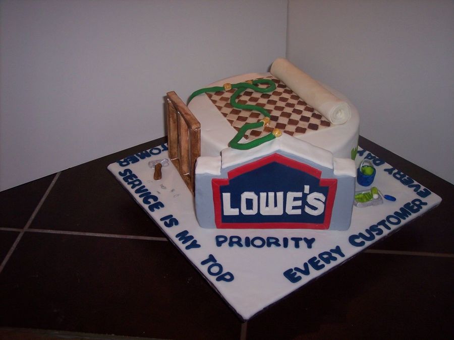 I work @ Lowe's. My HR manager asked me to make a sheet cake to celebrate the end of a management training course I was in. I don't do sheet cakes, so I did this instead. The faucet, paint bucket, roller tray & roller, hammer & nails, and 2x4 framed wall are all made of gumpaste and then painted. The garden hose is fondant, and the roll of vinyl flooring on top of the cake is gumpaste & fondant mixed.
