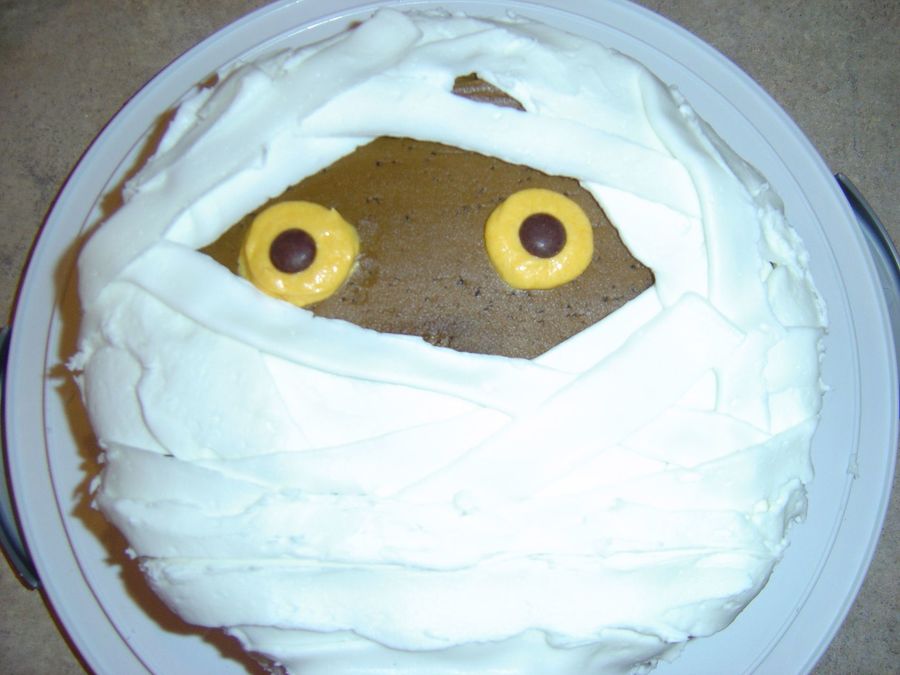 Easy mummy cake for work Halloween party. Think crumb coat and covered the rest with ribbon tip.