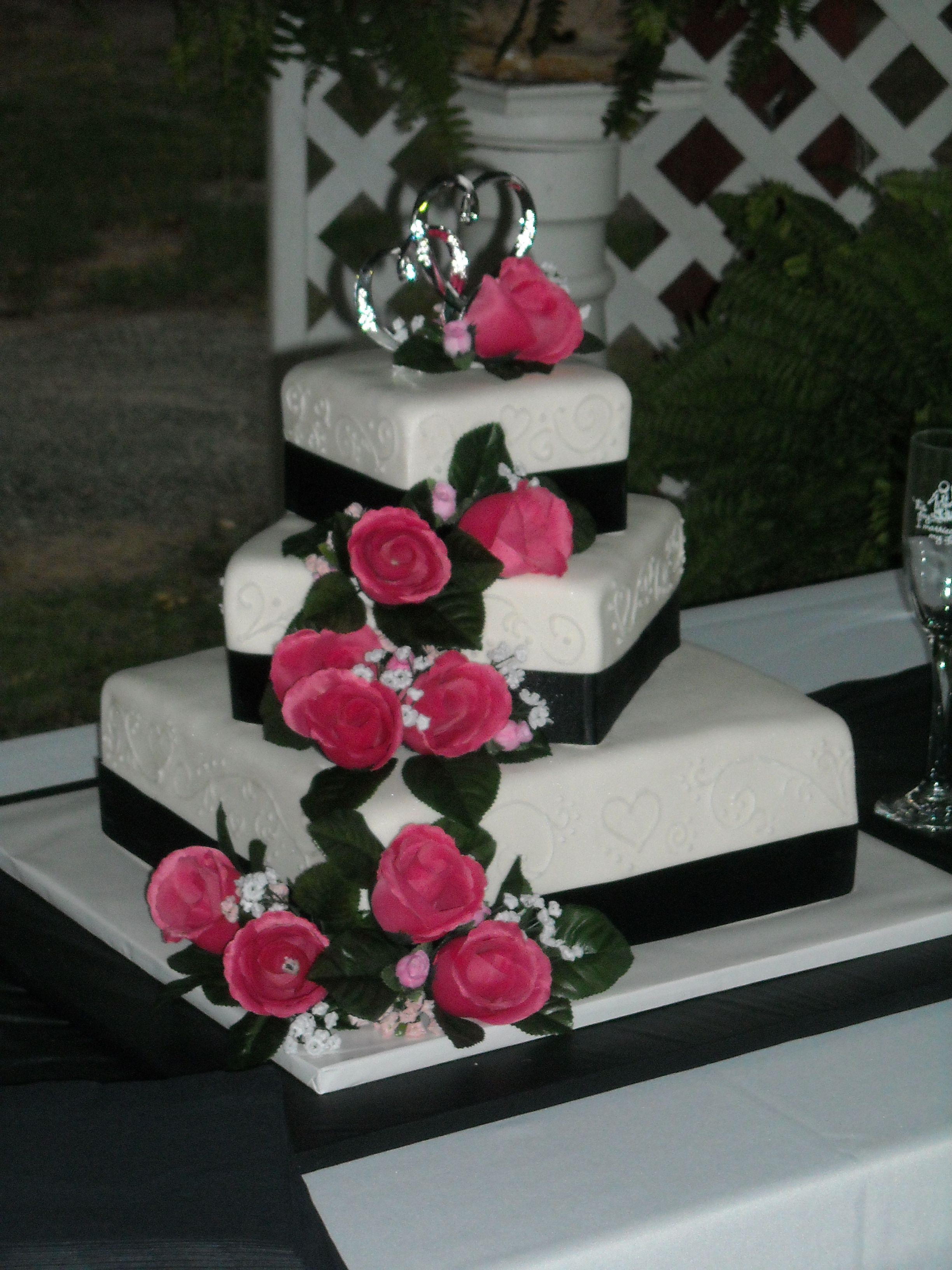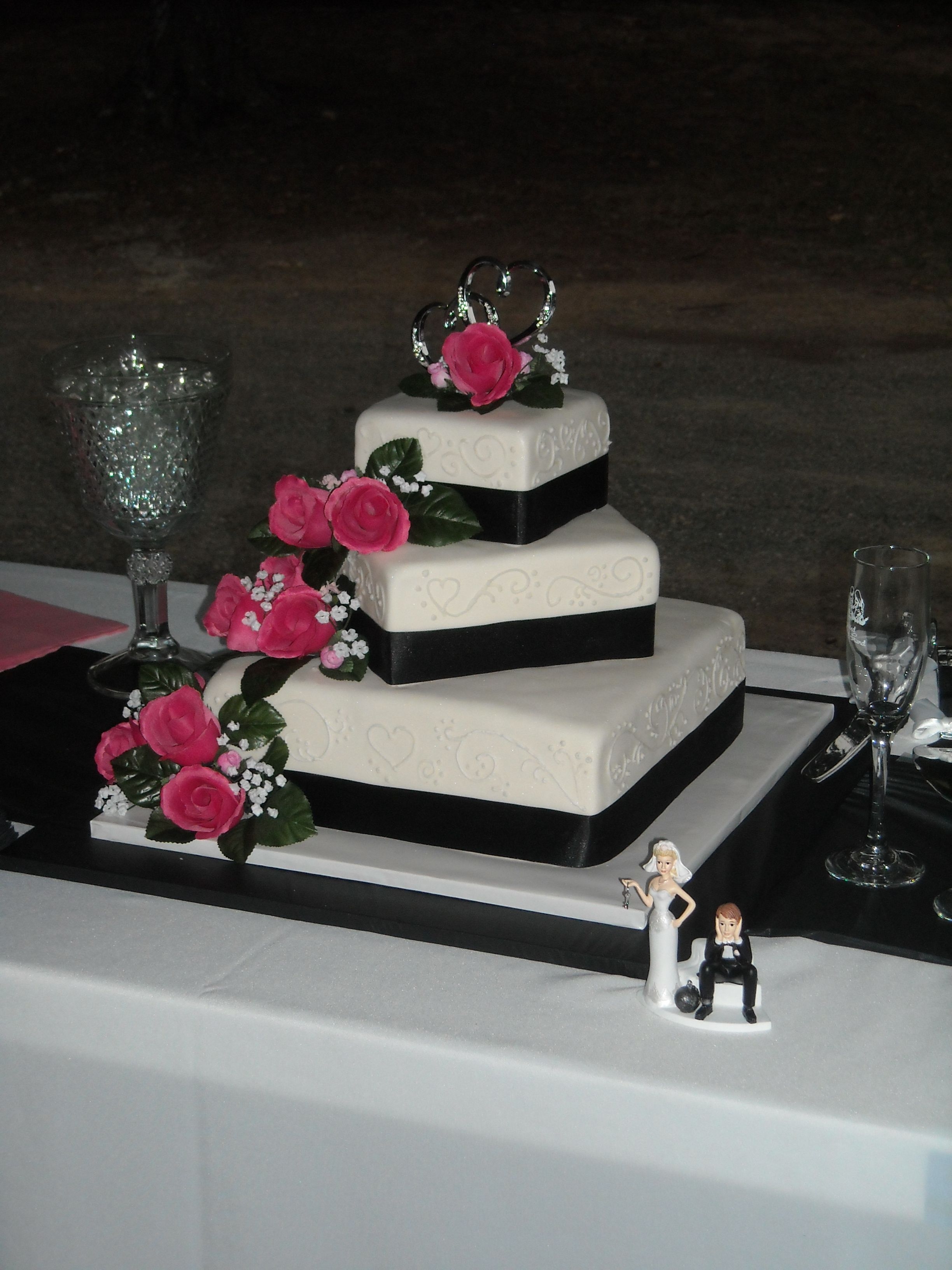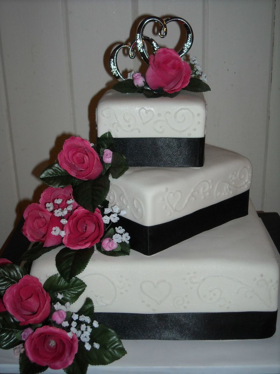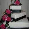 square cake with mmf, black ribbon, scrollwork and silk flowers