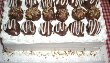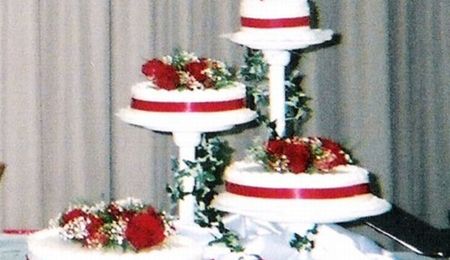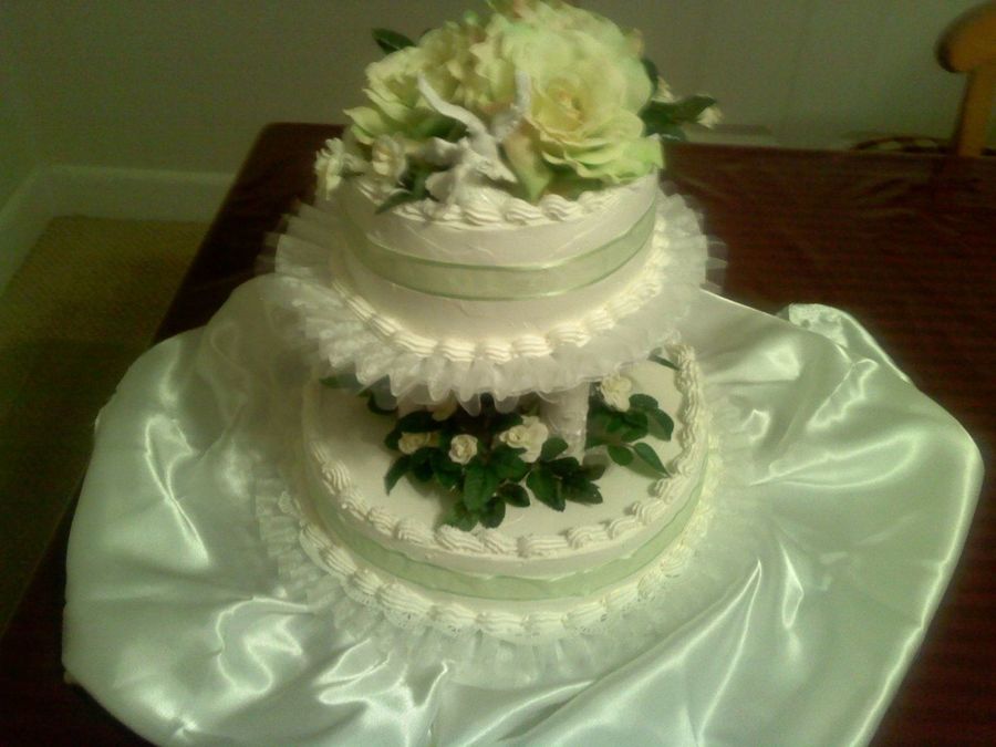Tres leches cake filled with strawberries for a small wedding. Her colors were white and a pastel green. THe roses are not real.
