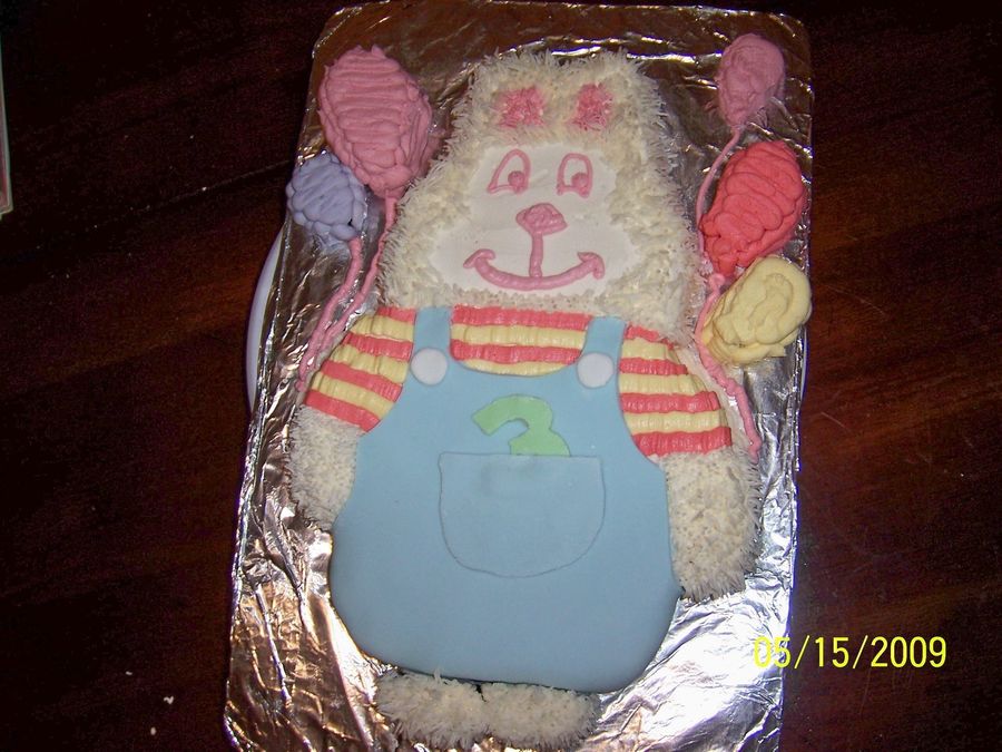 This is Max of Max and Ruby. The balloons, fur and shirt are covered with buttercream and the overalls are fondant.