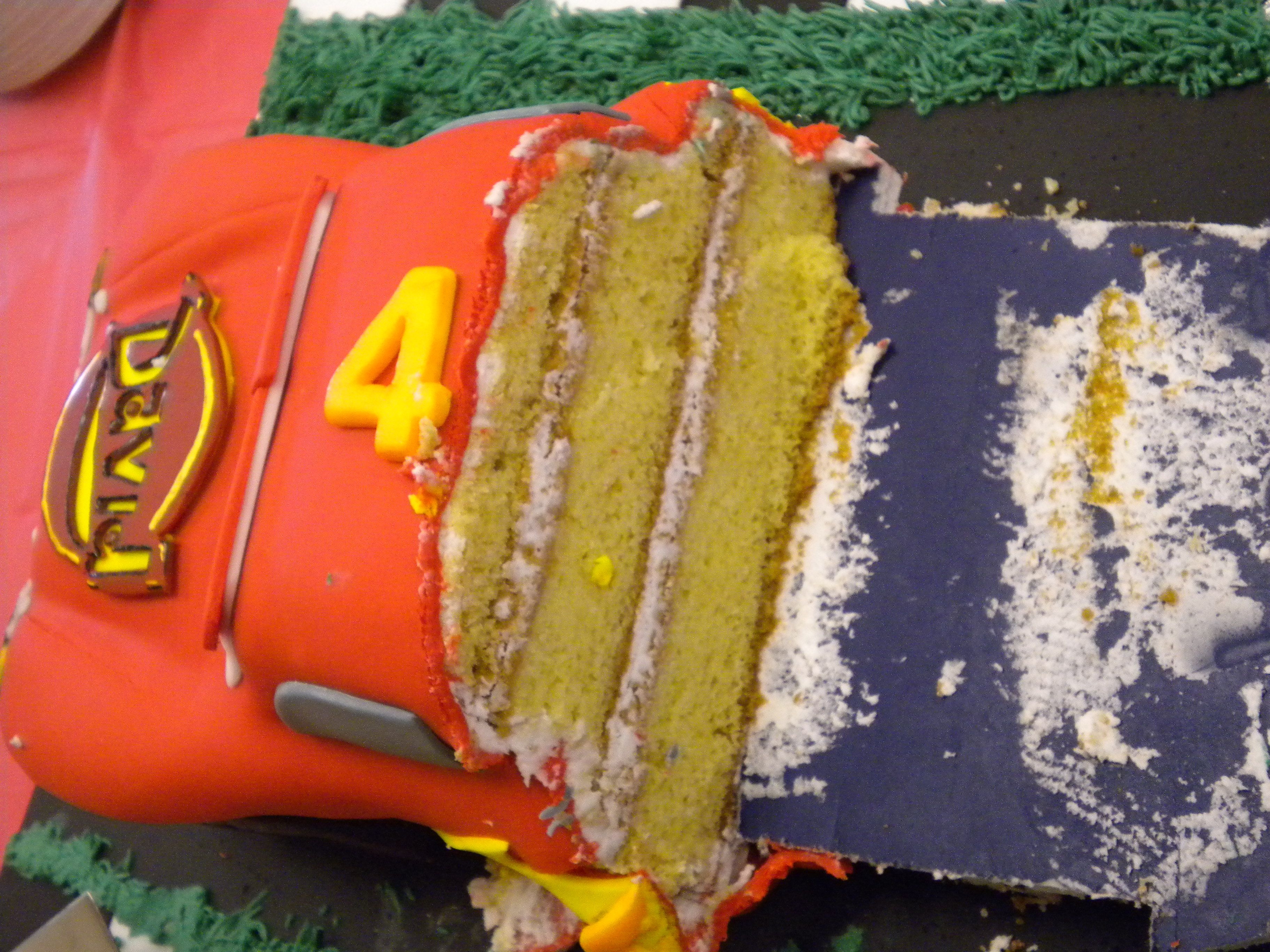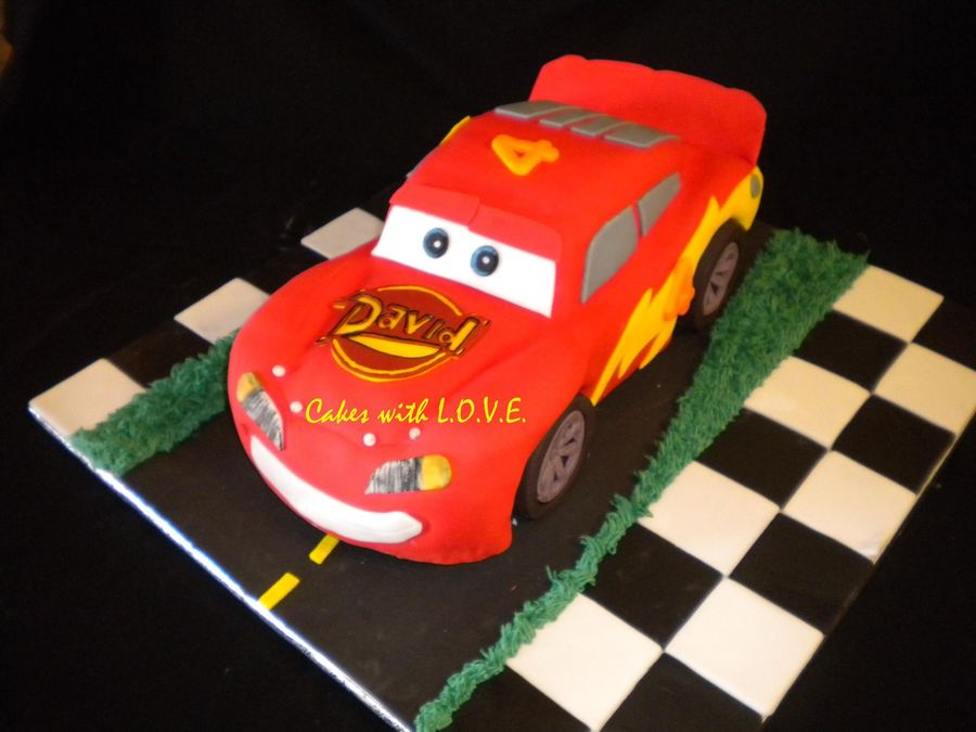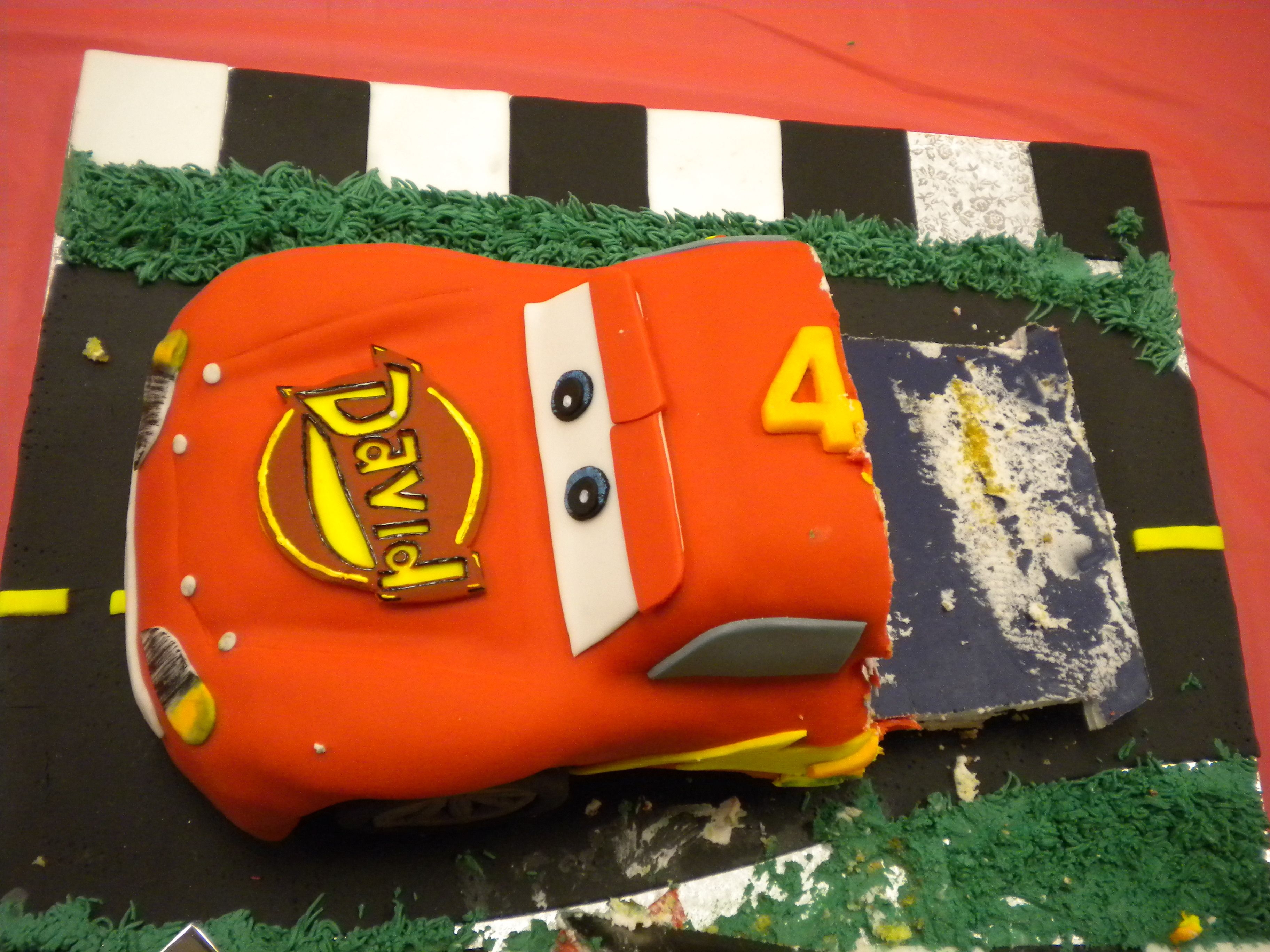 Done for our pastors son David, second Cars cake I make both using the childs name on hood instead of Rust-eze. It was a hit !!