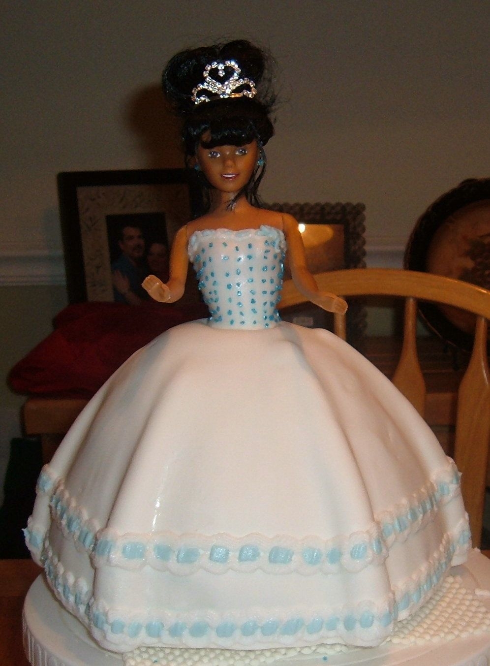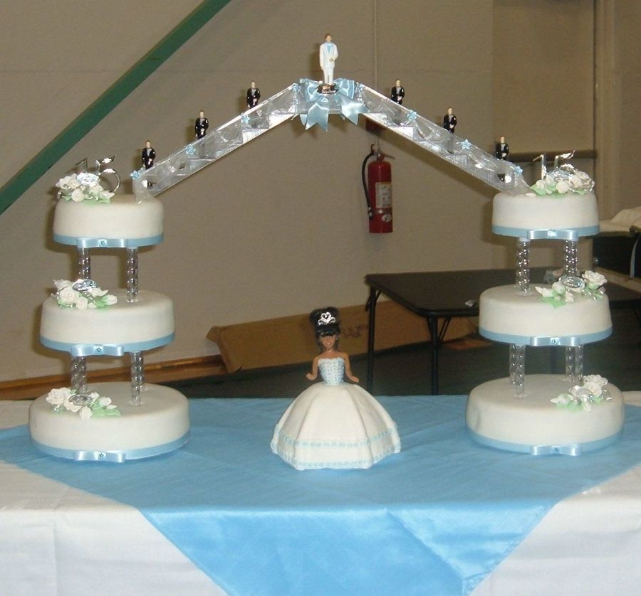 This was my first Quinceanera cake....I was very pleased with it untill I messed with it after I sat it up.....There was an air pocket I noticed on the side so I decided to let the air out and knew very well I should not mess with it.That's why you see the sink hole in the side of the right bottom cake. As I always say I live and learn with every cake. The roses are gumpaste