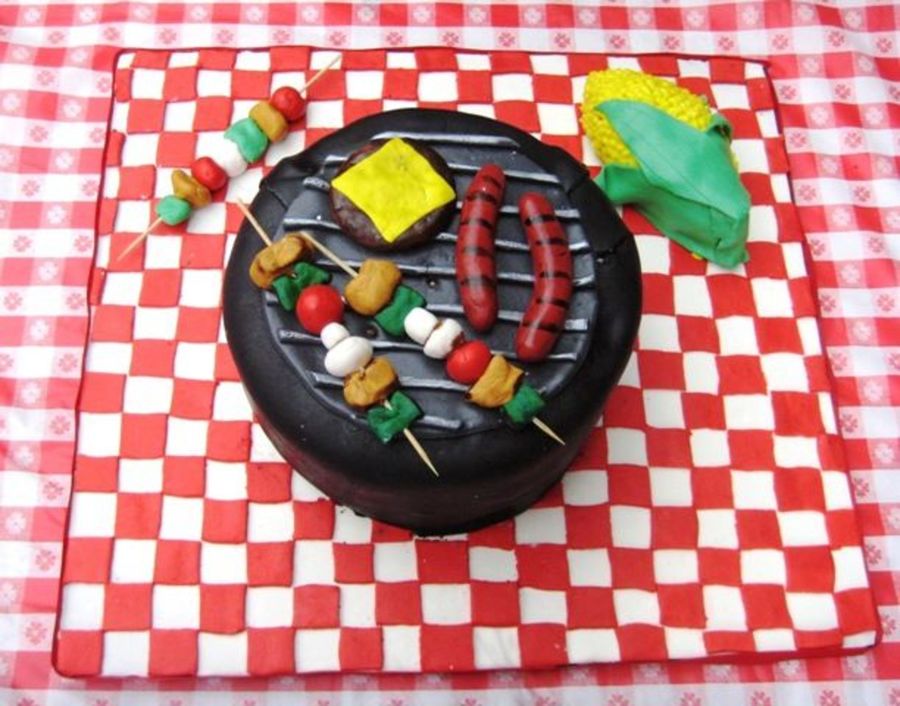 Cake for a company bbq. Red velvet with cream cheese frosting. Everything edible except the skewers!