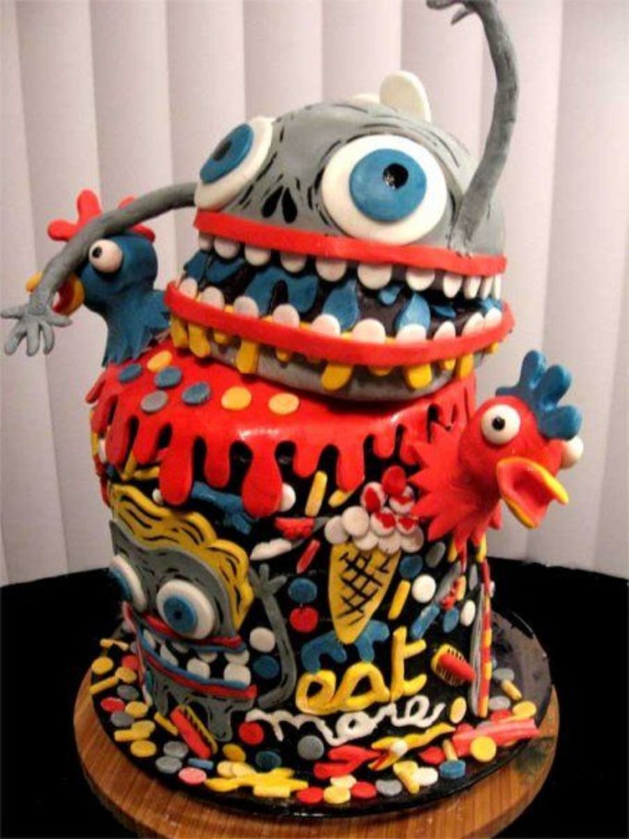This cake was completed 7/27/2009 for an online cake competition. I chose a unique T-Shirt design and created my cake using that design. It is made of 8 layers of chocolate, steel blue icing, rice krispy treats (topper) and a bit of fondant. I hope you enjoy it - thanks.
