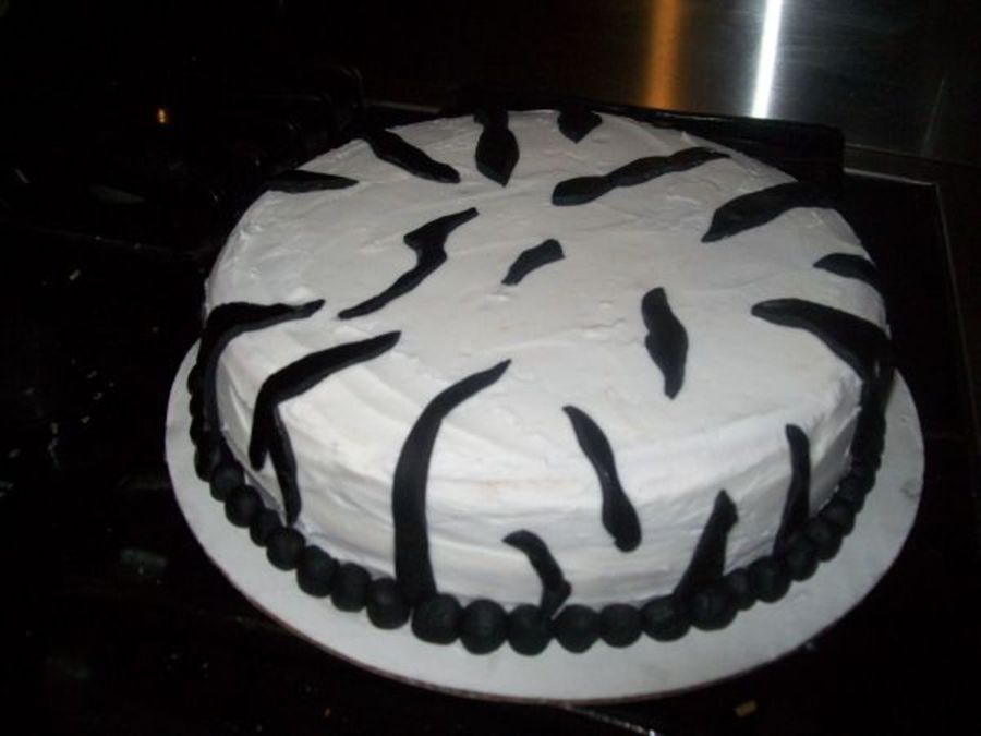 This is my first iced cake. I made this for a co-workers jungle themed baby shower. She loved the cake. White with white frosting, the stripes are fondant. I'm still working on the smoothing of the icing.