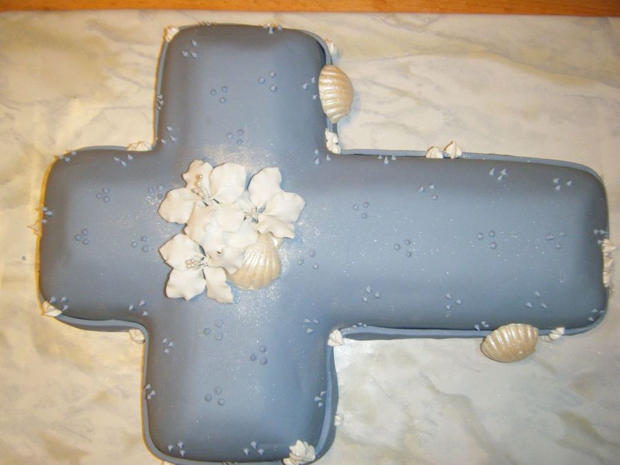 White covered in mmf. Royal icing drop flowers and white chocolare shells dusted with pearl dust.