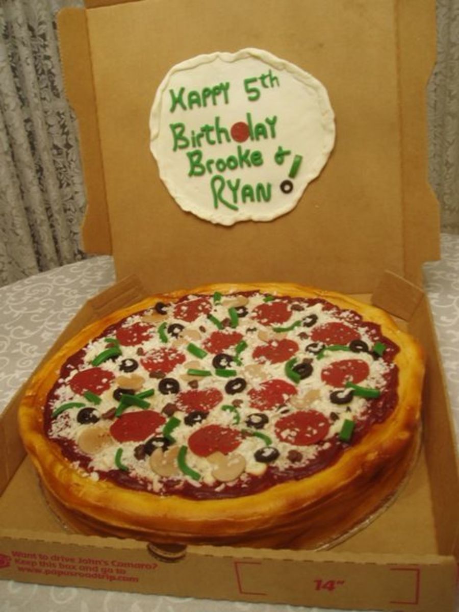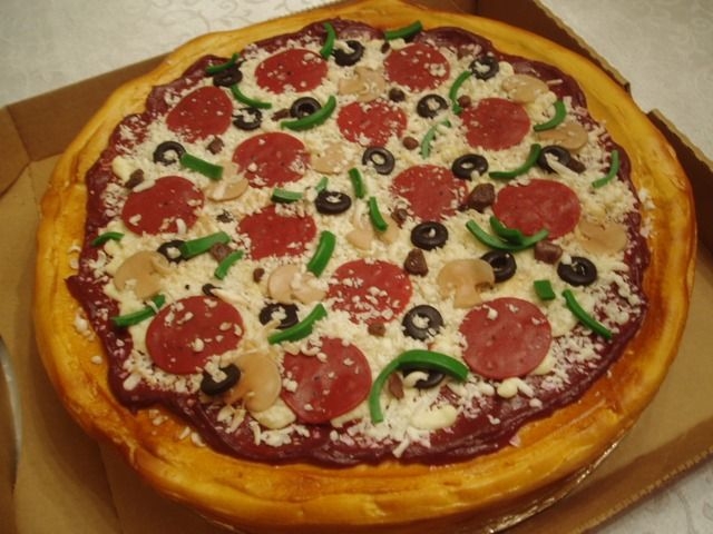 This is a marble cake, iced in buttercream and airbrushed. The pepperoni, green peppers, olives and mushrooms were made from modeling chocolate. I got the idea from this website to put the cake in the oven for just a very quick amount of time to let the white chocolate "cheese" melt ever so slightly and it really seemed to make a big difference.
