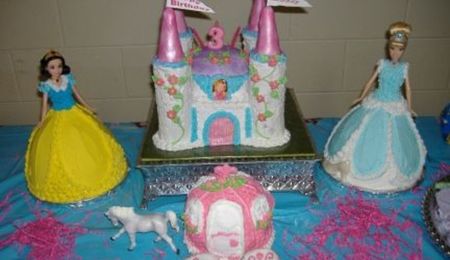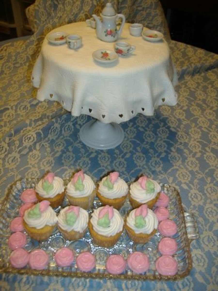 I made this cake for a Tea Party at our local library. It is an 8" round , 1 layer cake that I put on top of a small compote bowl for the table and I covered the cake with fondant and punched holes in the fondant with a hole punch. The tea set was purchased from a thrift store. I made tiny cupcakes and mints also.