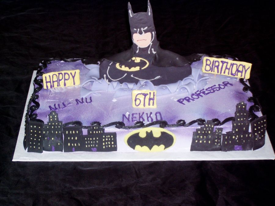 This is a 1/2 sheet cake iced in butter cream. Batman and writing are made out of chocolate and his cape and other decorations are made out of fondant