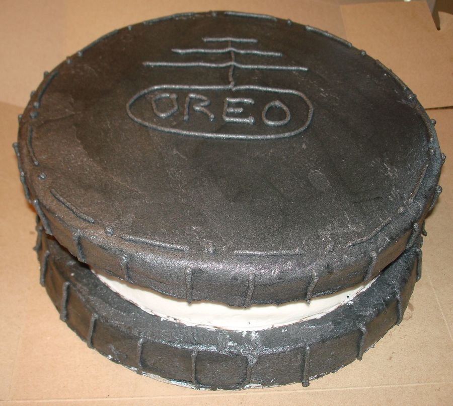 I made this really quick. The cookie part is chocolate cake and the filling is white cake. Covered in butter cream icing.